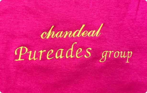 お持ち込みのTシャツにオリジナル刺繍を行っています。サイズ:横4cm 糸色:33 ネオンイタリアンレッド