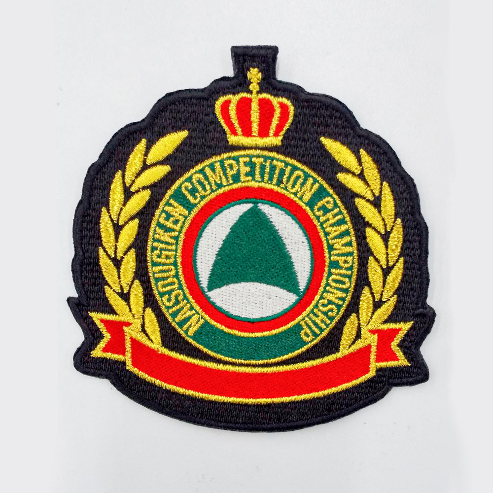 サイズ:横10cmにてのワッペン制作です。土台:81008エンブクロス 黒 、フチ糸色:ブラック(23-100)。使用糸色:金(0-104)、レッド(23-99)、深緑(13-129)、アイボリー(8-653)