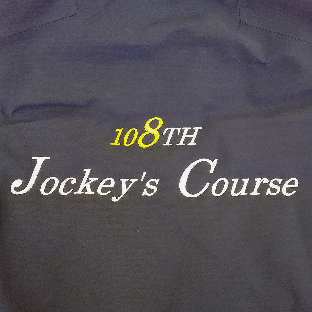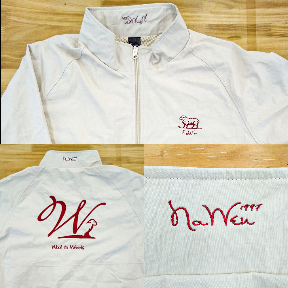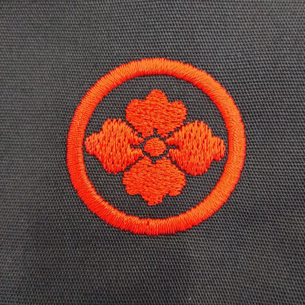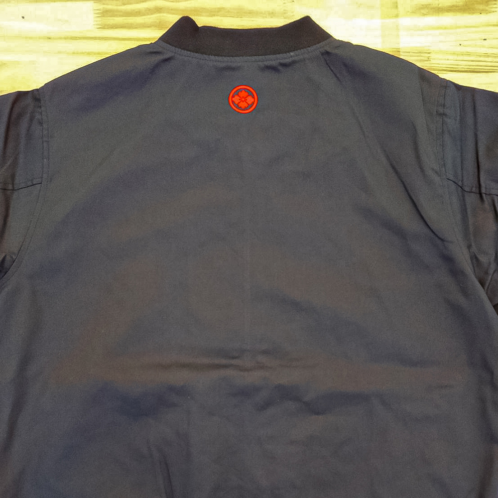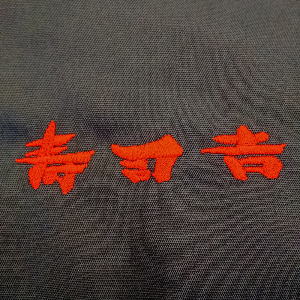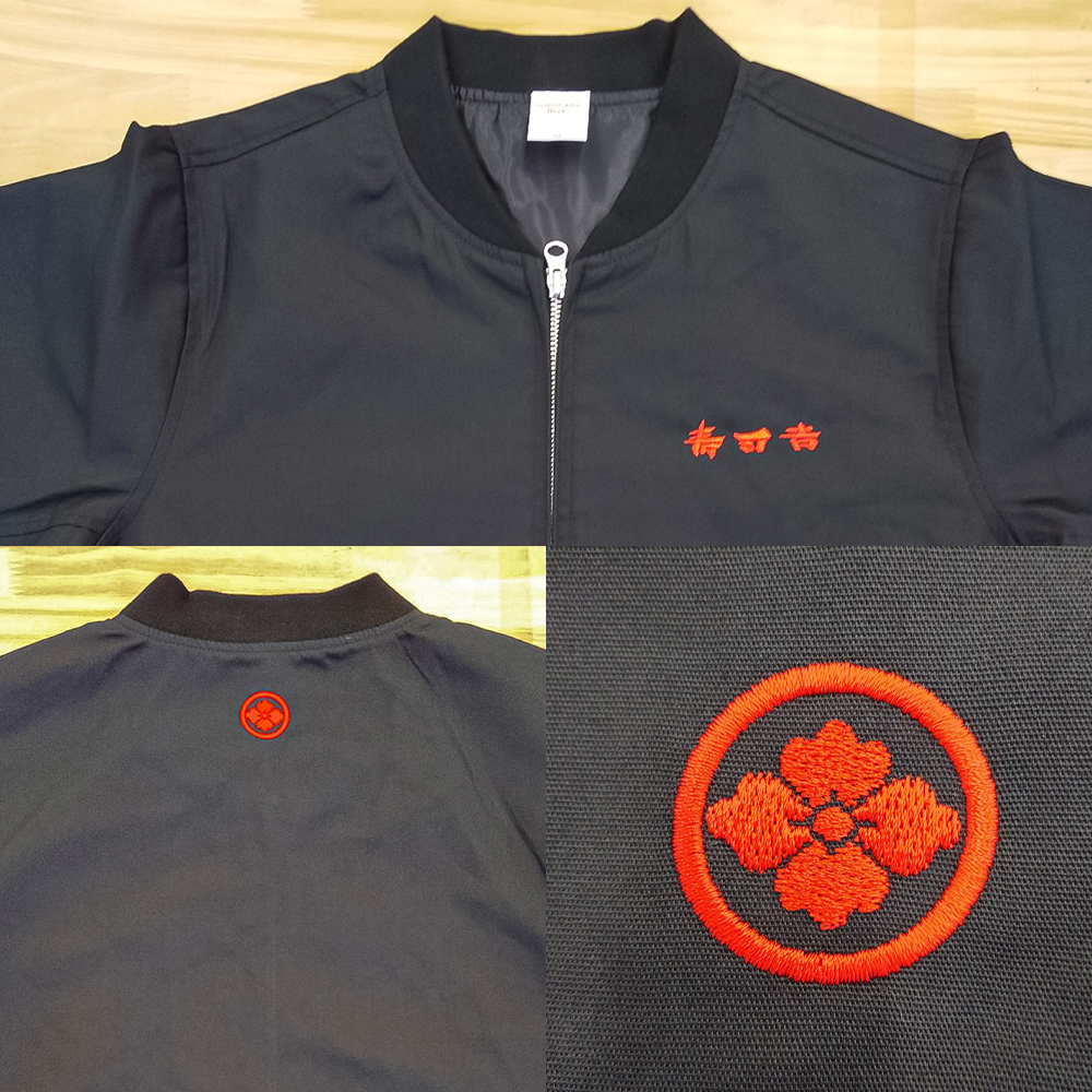 お持ち込みのジャケットにオリジナル刺繡を前面胸元横約5cm×高さ4cm、背面襟約横5cm×縦1.6cm、背面W:横約25cm×H19cmにて行っています。糸色はすべてバーガンディ(1-1007)。