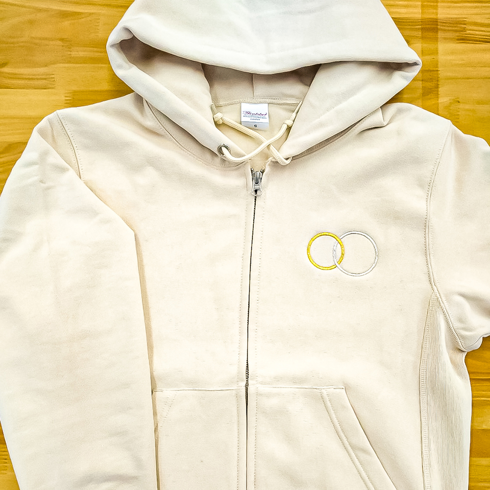 00229-FVZ 12.0oz 裏起毛 ヘビージップパーカーの前面にロゴと裏面にネームの刺繍を入れました。前面サイズ:横8cm×縦5cm 背面ネームサイズ:1文字1cm 糸色:前面:G3 ライトイエローゴールド、G27 シルバー 背面:アイボリー(8-653)