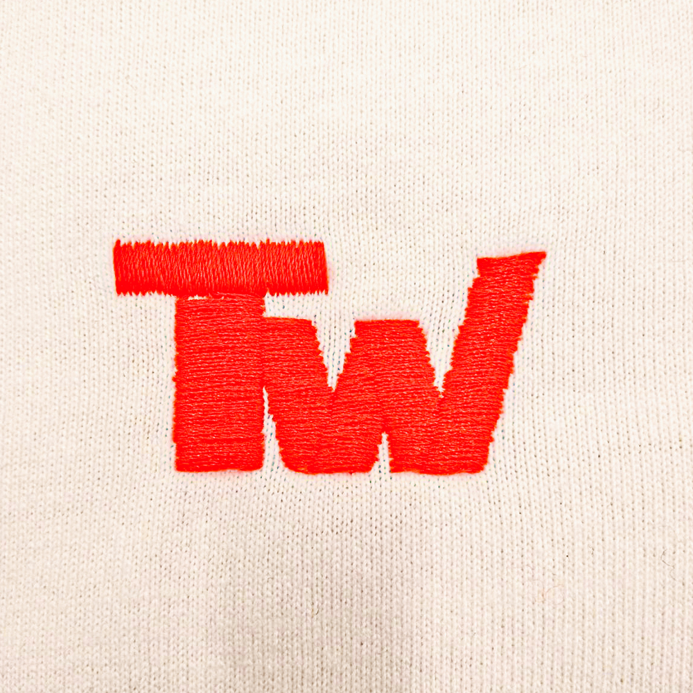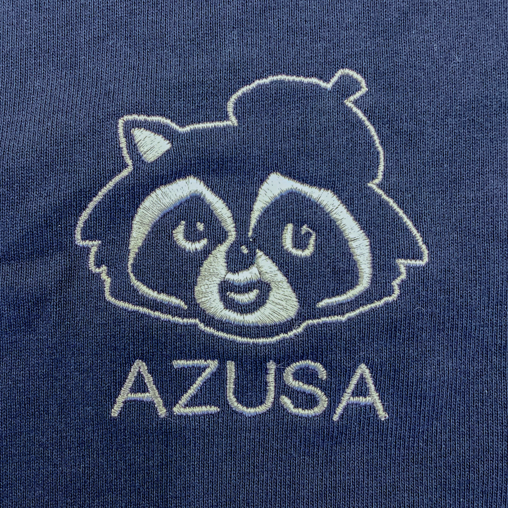 お持ち込みのTシャツにオリジナル刺繍を行っています。サイズ:横4cm 糸色:33 ネオンイタリアンレッド