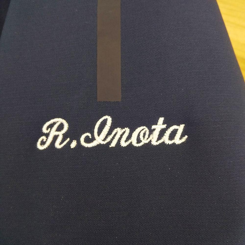 お持ち込みのジャンパーにネーム刺繍を入れています。糸色:山吹色(5-192)、ホワイト(23-98)。書体は背面:A-9.ロマンイタリック体、腕:A-11.筆記体