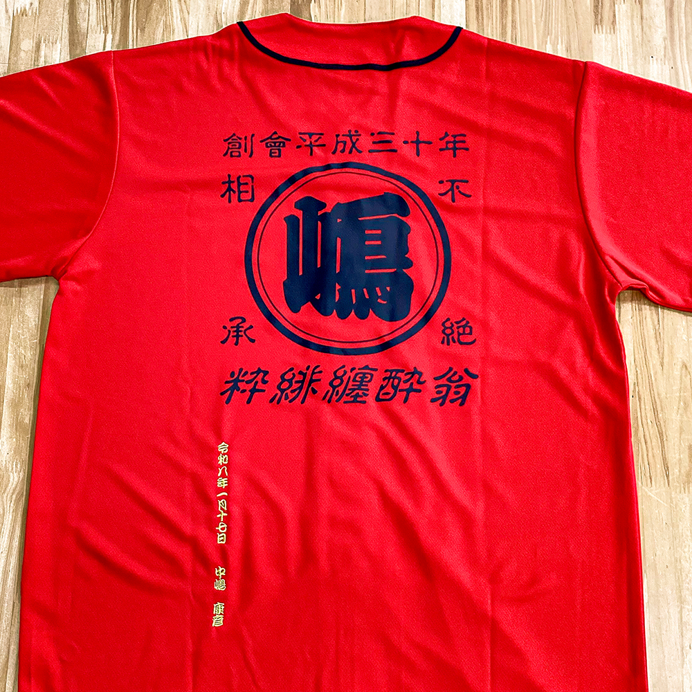 お持ち込みのベースボールシャツ背面にネーム刺繍を行いました。1文字1cm。糸色:金(0-104)、書体:A-6.勘亭流