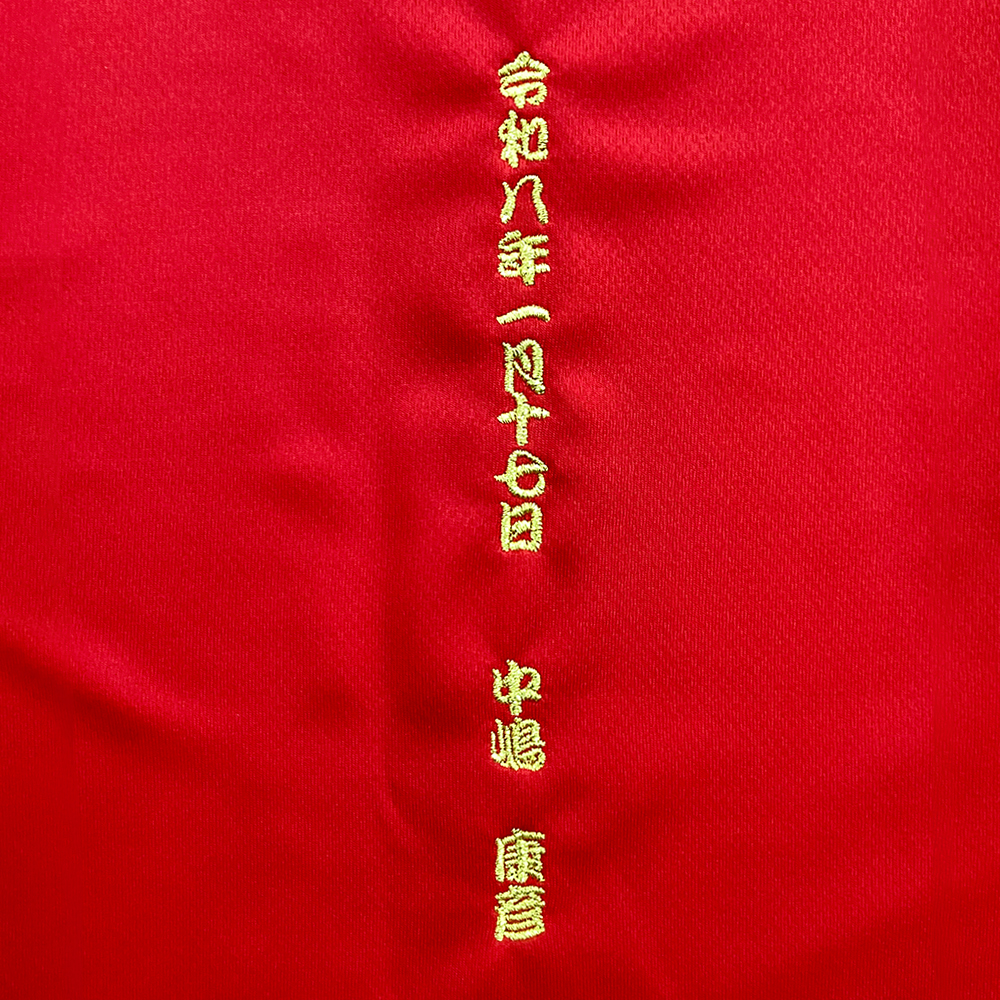 7079 T/C スタジアム ジャケットへ刺繍を行いました。糸色:朱色(5-1146)サイズhは左胸:横70mm 衿下:30×30mm