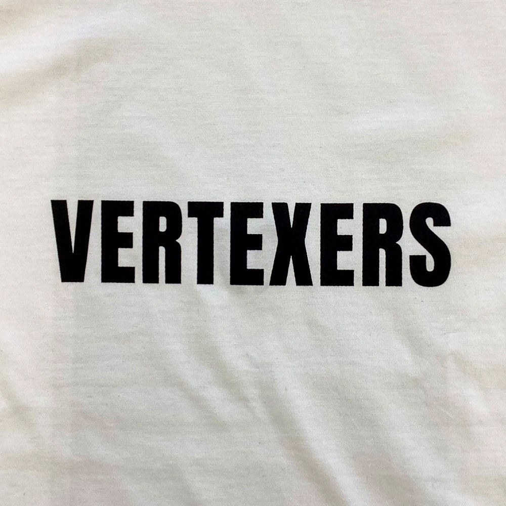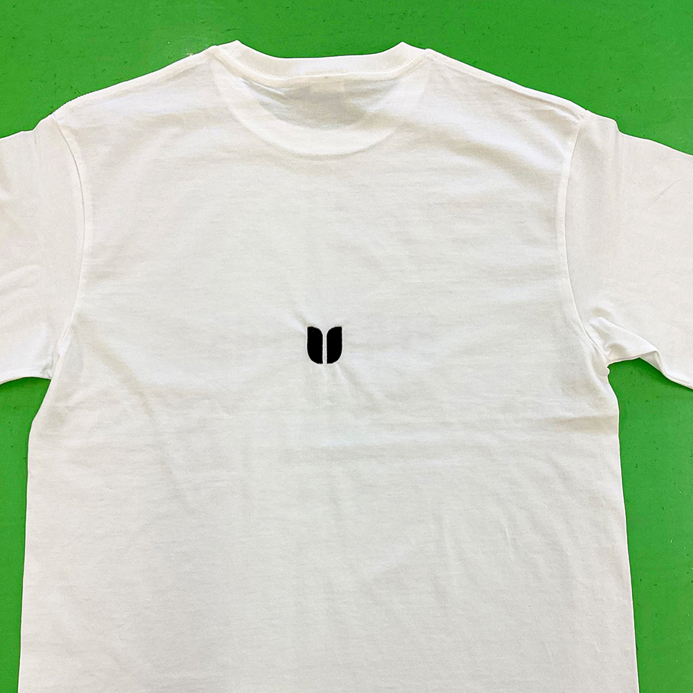1100 6.5オンス ファインジャージー Tシャツへ表面にシルクスクリーンプリント、背面に刺繍を入れています。お持込みのタグ縫付も行っています。プリントサイズ:横20cm、プリントカラー:ブラック(C-22)。刺繍サイズ:横3cm、刺繡カラー:ブラック(23-100)
