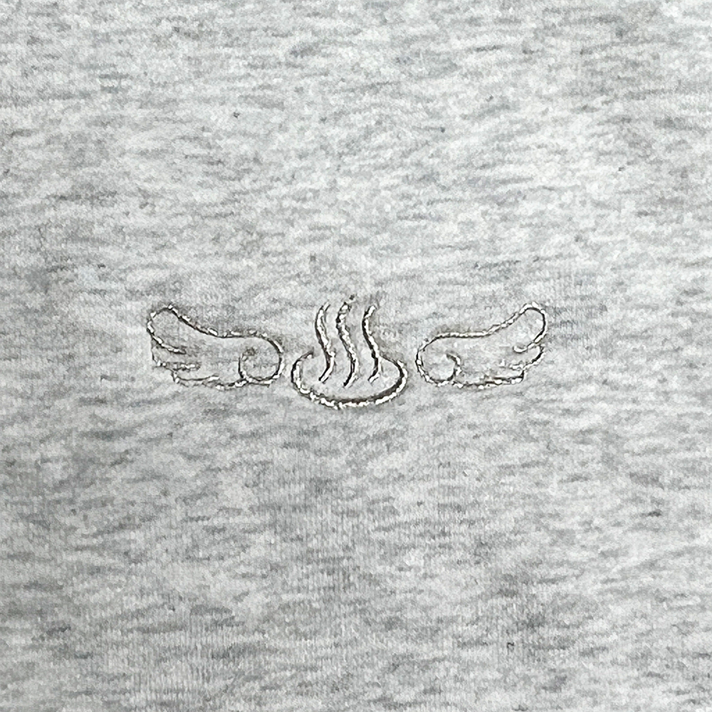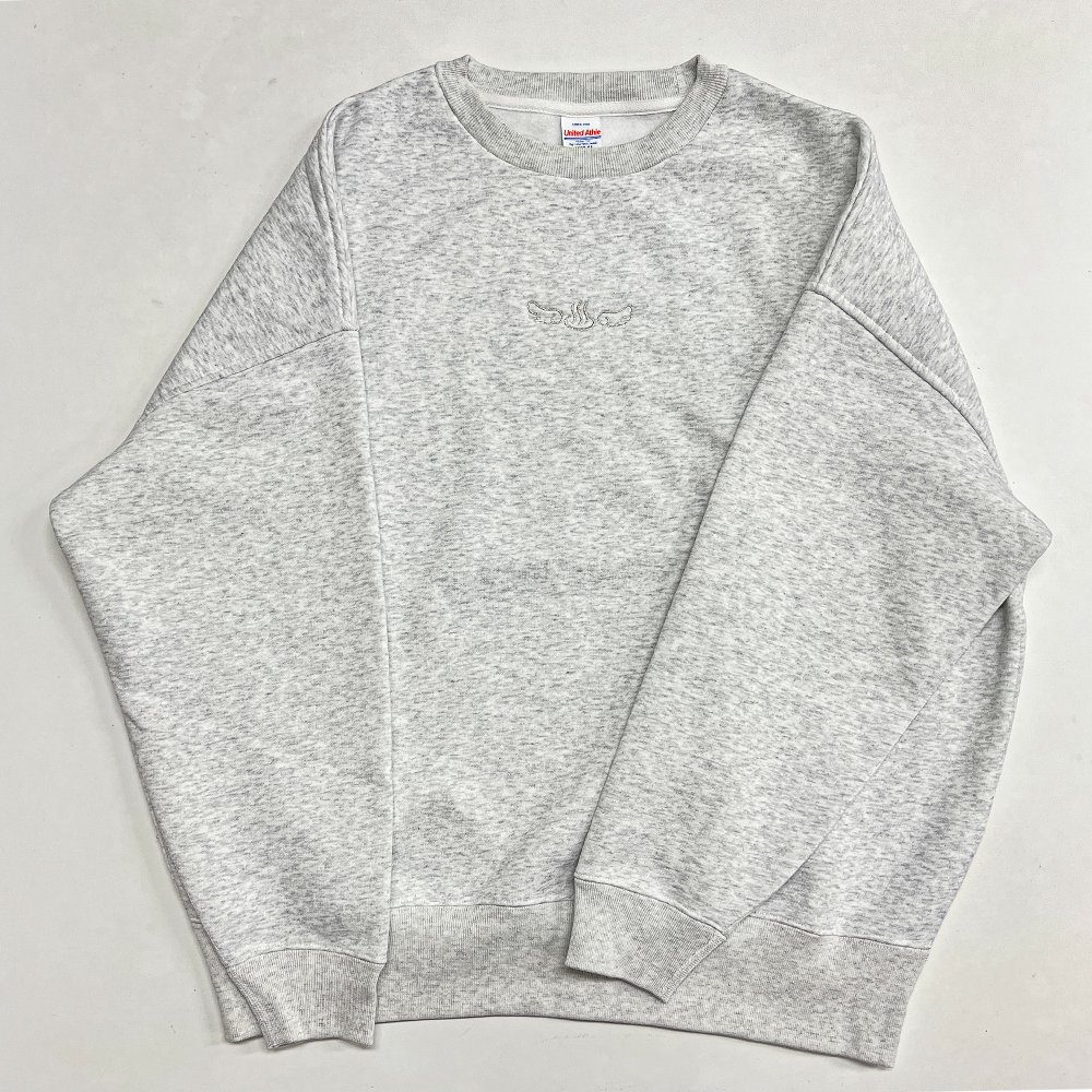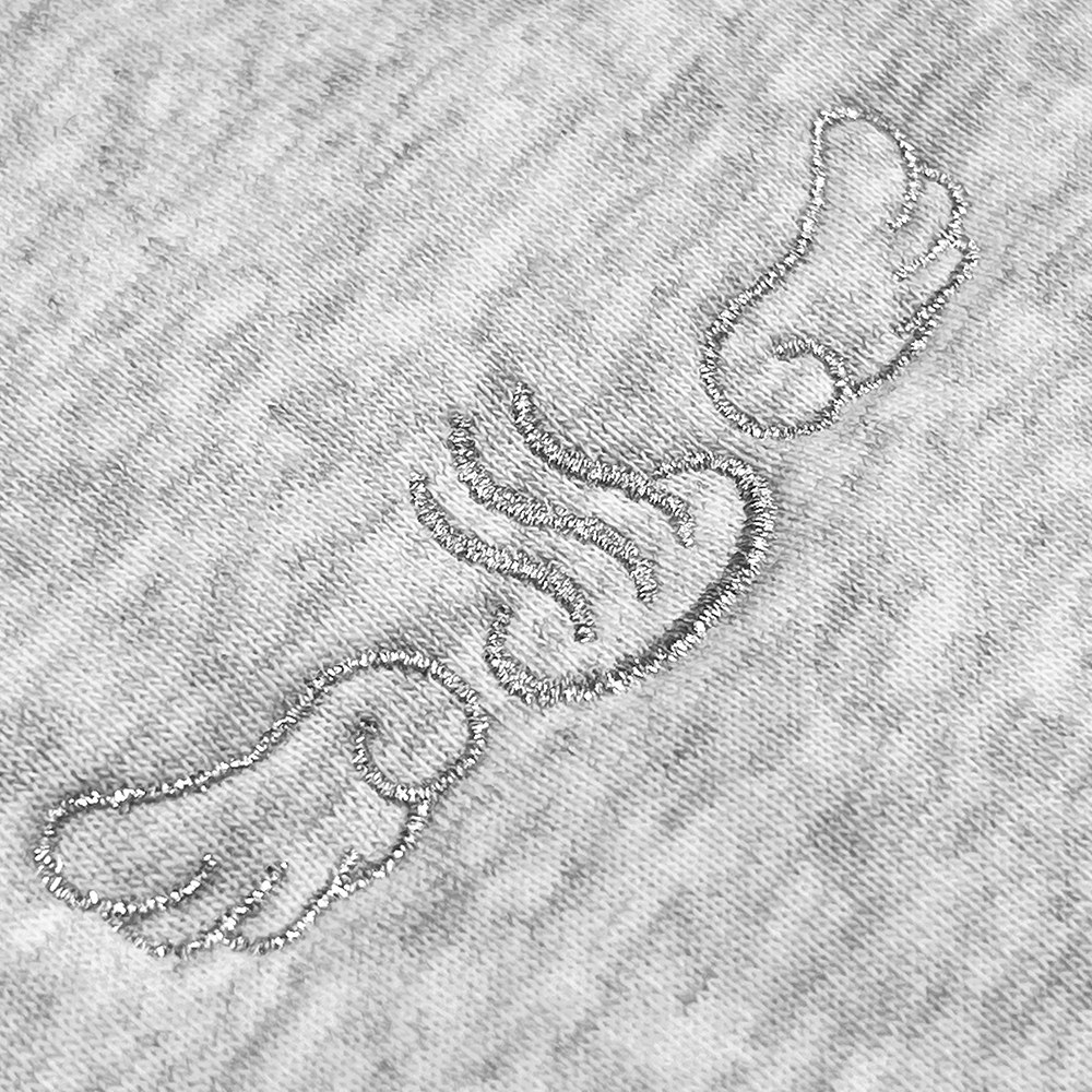 5627 10.0オンス T/C ビッグシルエット クルーネック スウェット(裏起毛)へオリジナル刺繡をおこなっています。横8cm 糸色:銀(0-101)