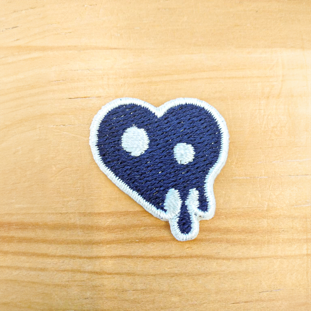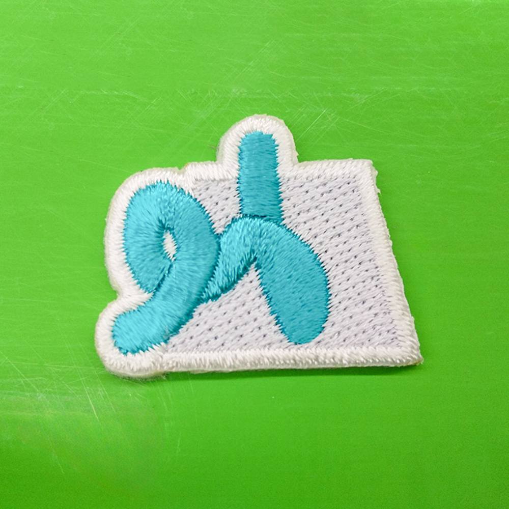 横2.5cm × 縦2.9cmサイズのワッペン。土台は82000 白エンブクロス・フチの糸色ホワイト(23-98)、糸色はネイビー(17-38) ホワイト(23-98)で仕上げています。