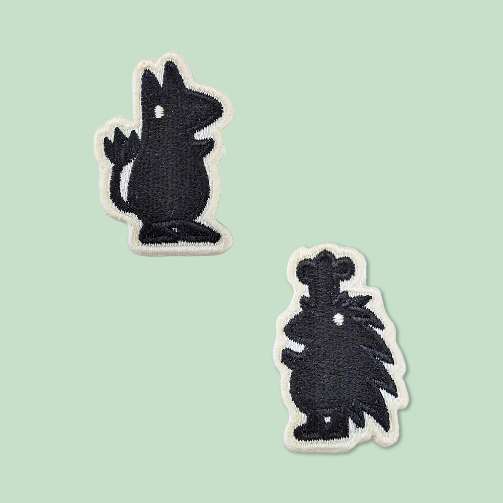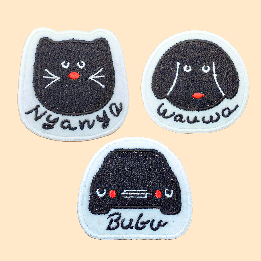 オリジナルワッペン3種類です。土台が701 フェルト白、糸色はブラック(23-100)、レッド(23-99)、ホワイト(23-98)。サイズは横5cmでの作成。