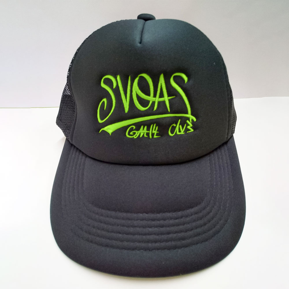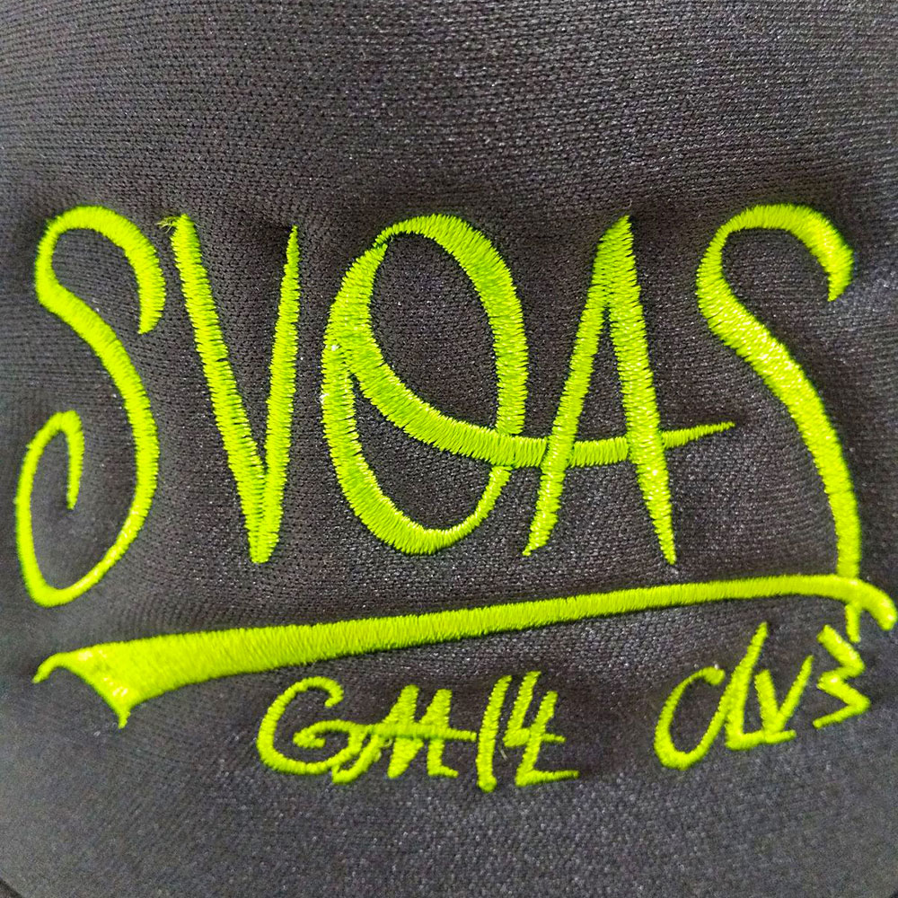 キャップへのオリジナルロゴ刺繍です。刺繍糸の黄緑がブラックのキャップボディに良く映えた素敵な仕上がりになりました。