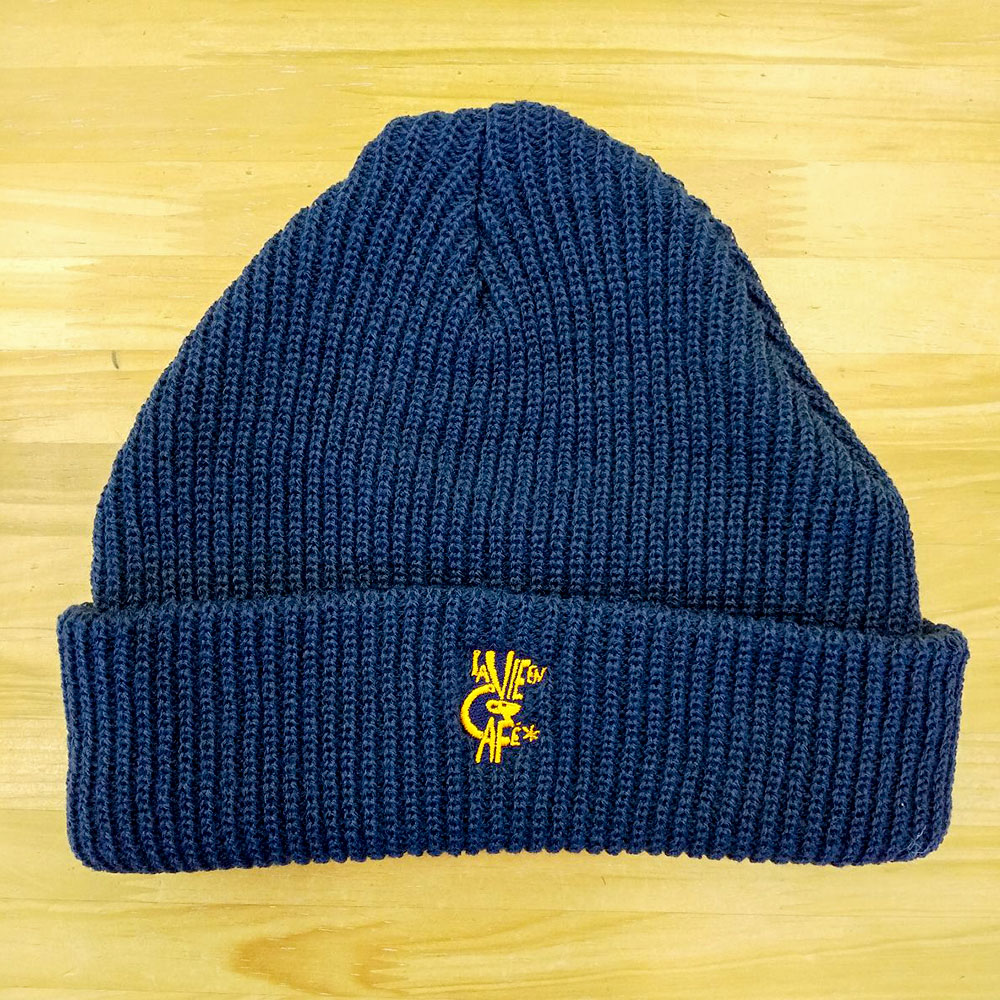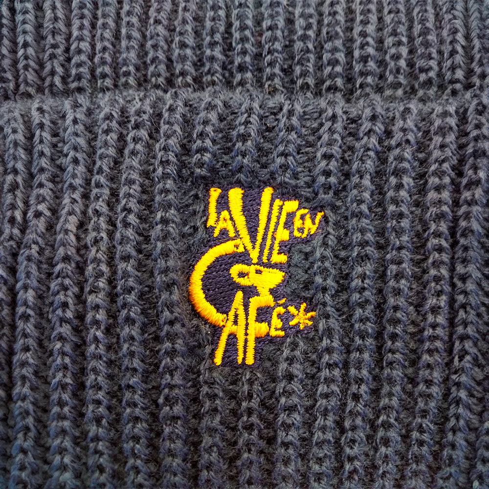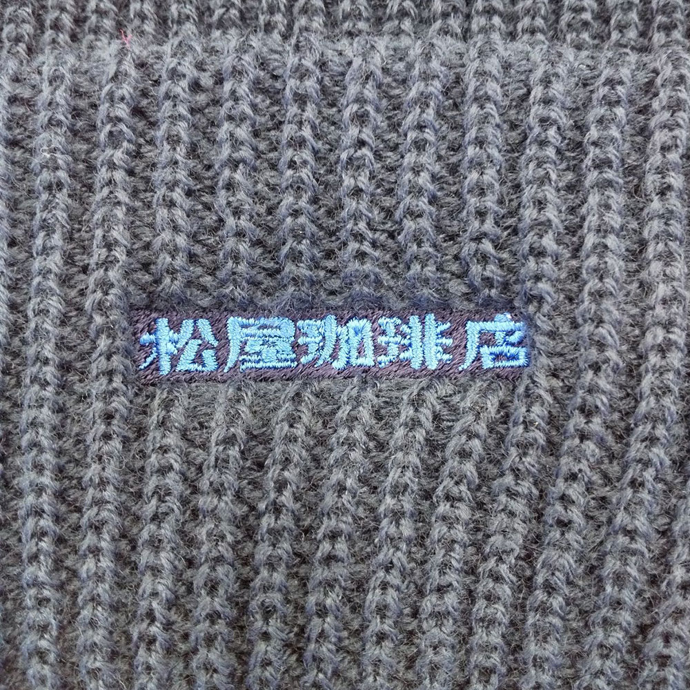 ビーニーに表と裏でオリジナルロゴ刺繍を2パターン刺繍しました。糸色が金茶(4-474)サイズ:横2.5cm×縦3cm程度と糸色がロイヤルブルー(17-115)横4.5cm×縦1cm