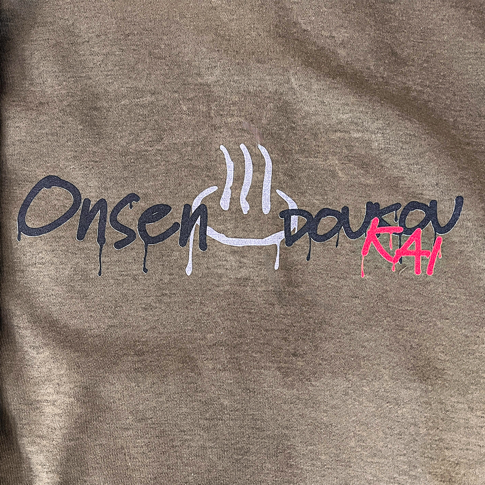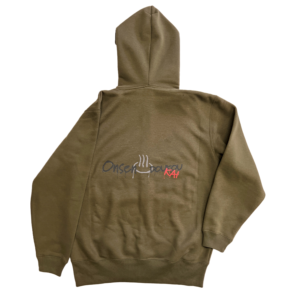 インクジェットプリントでパーカーを仕上げました。ボディが濃色なので、下に白を敷いてプリントを行っています。パーカーは5620 10.0オンス T/C スウェット フルジップ パーカ(裏起毛)のオリーブを使用