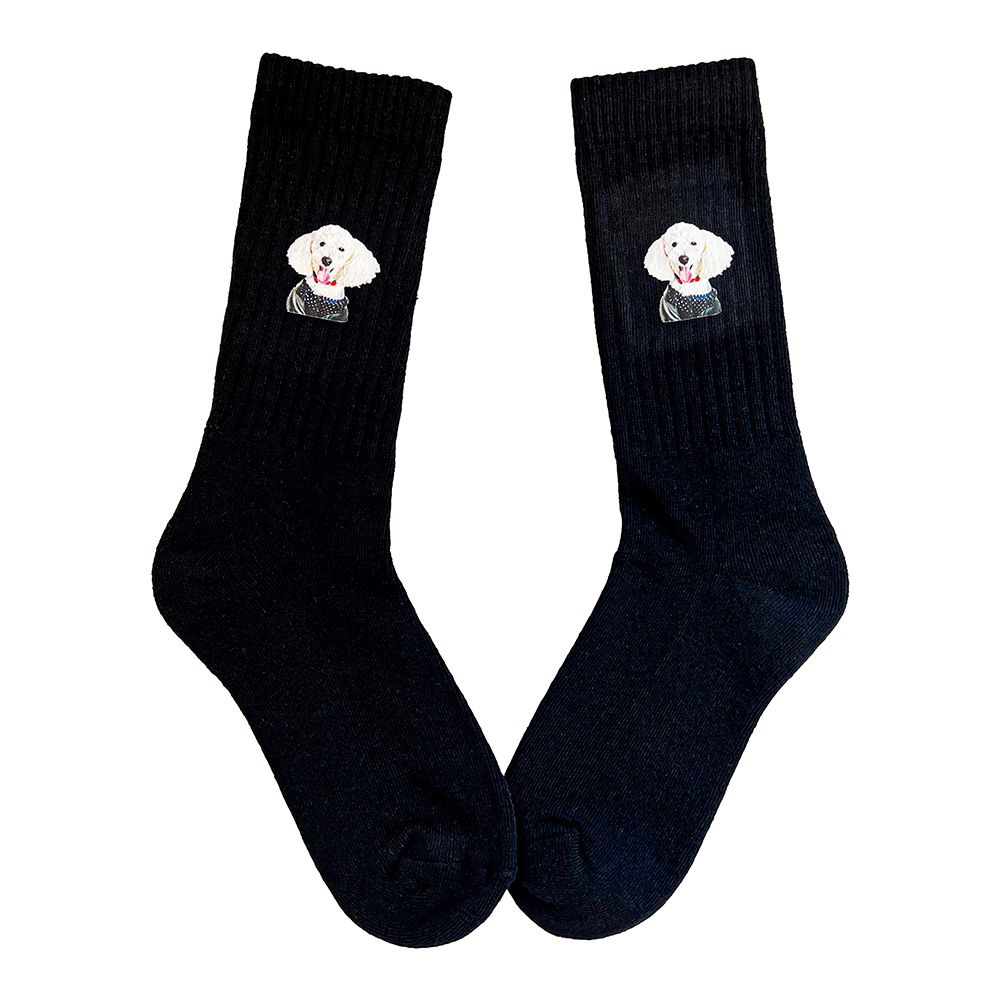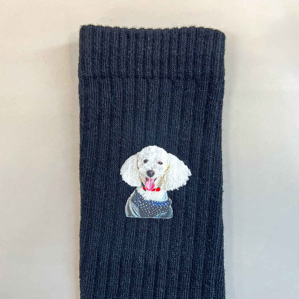 愛犬こむぎくんのお写真をDTF転写プリントで靴下にプリントしました。フルカラーデザインが映えます。