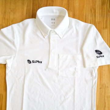 お持込みのユニクロポロシャツとシャツの胸元と袖にそれぞれ刺繍いたしました。右胸:高さ2cmx横8cm、 袖:高さ4.5cmx横4cm。糸色:ブラック(23-100)