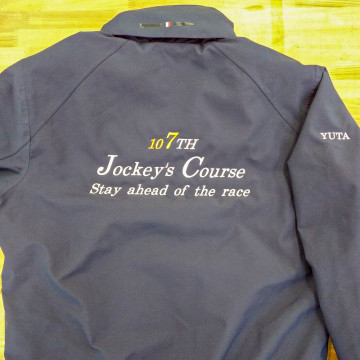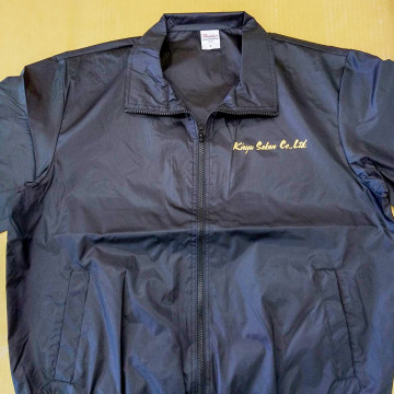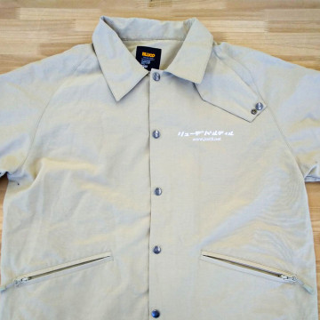 お持込みのコーチジャケットにオリジナルロゴの刺繍を行いました。同じロゴでもジャケットによって印象が変わります。サイズは横11cm。糸色はホワイト(23-98)