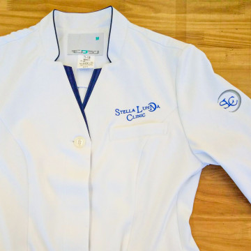 お持ち込みのドクターコートにオリジナル刺繡を行っています。【サイズ】左胸:横8cm、左袖:縦4cm 【糸色】左胸: ロイヤルブルー(17-115)、左袖:ロイヤルブルー(17-115)、グレー(22-676)。スカイグレー(22-678)