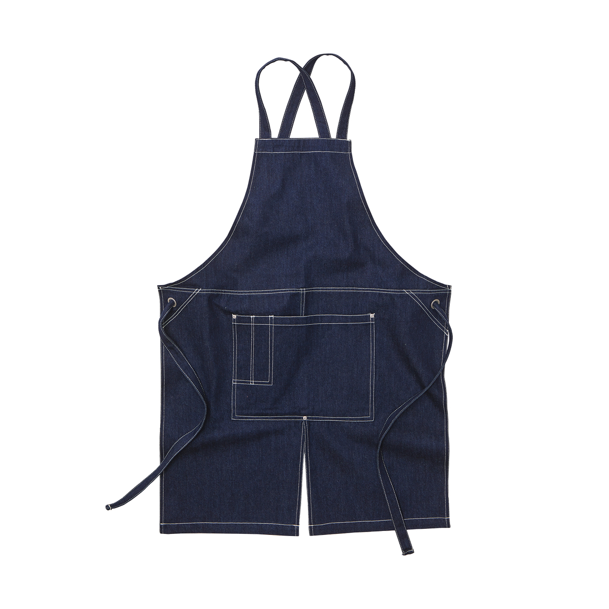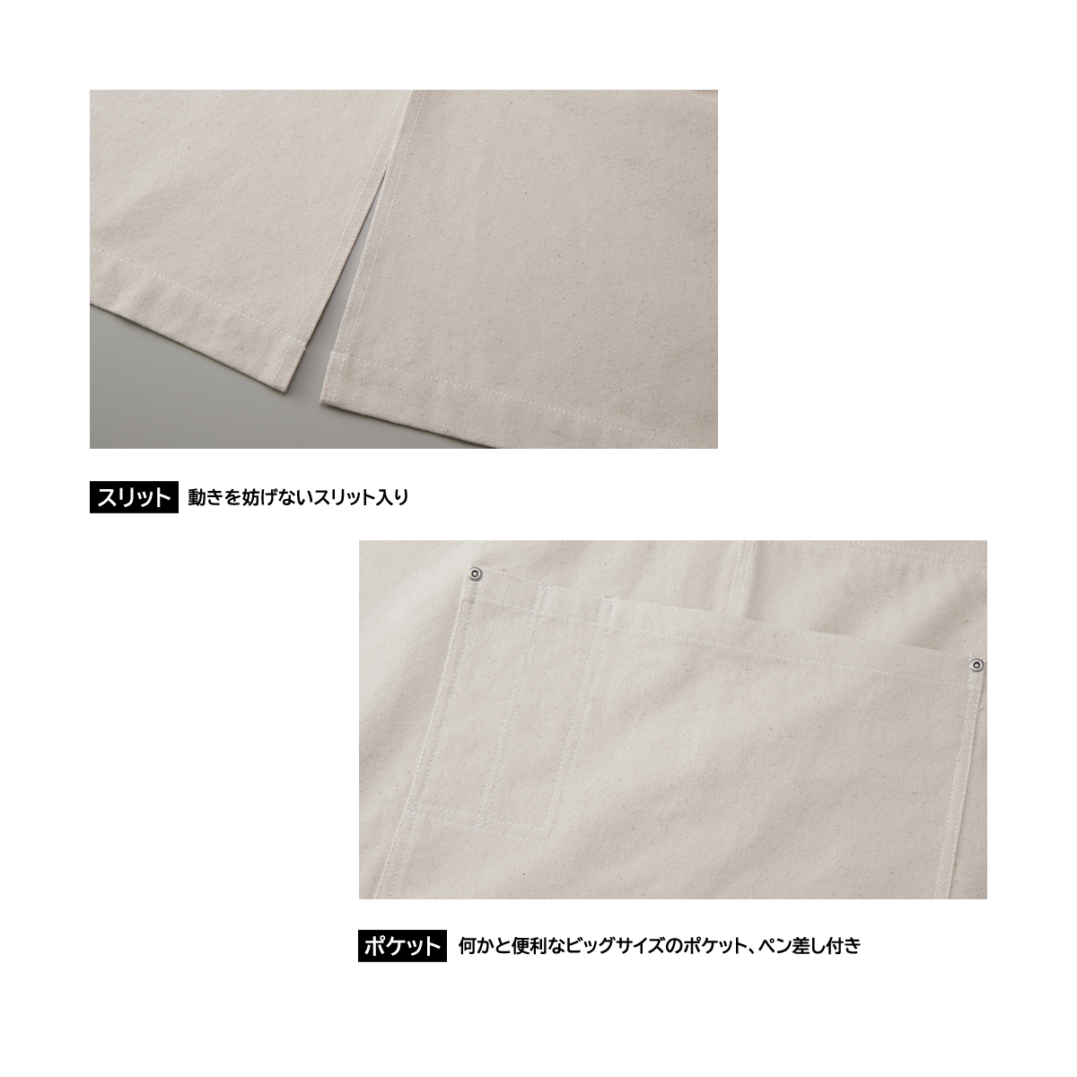 厚みのあるキャンバス地を縫製前に水洗いし、乾燥機にかけることにより縮みと型くずれに強いエプロンに仕上がりました。フロントにスリットが入ることによりしゃがみやすくなる為、キッチンやガーデニングなど動きの多いワークウエアとして大変使い勝手が良いです。