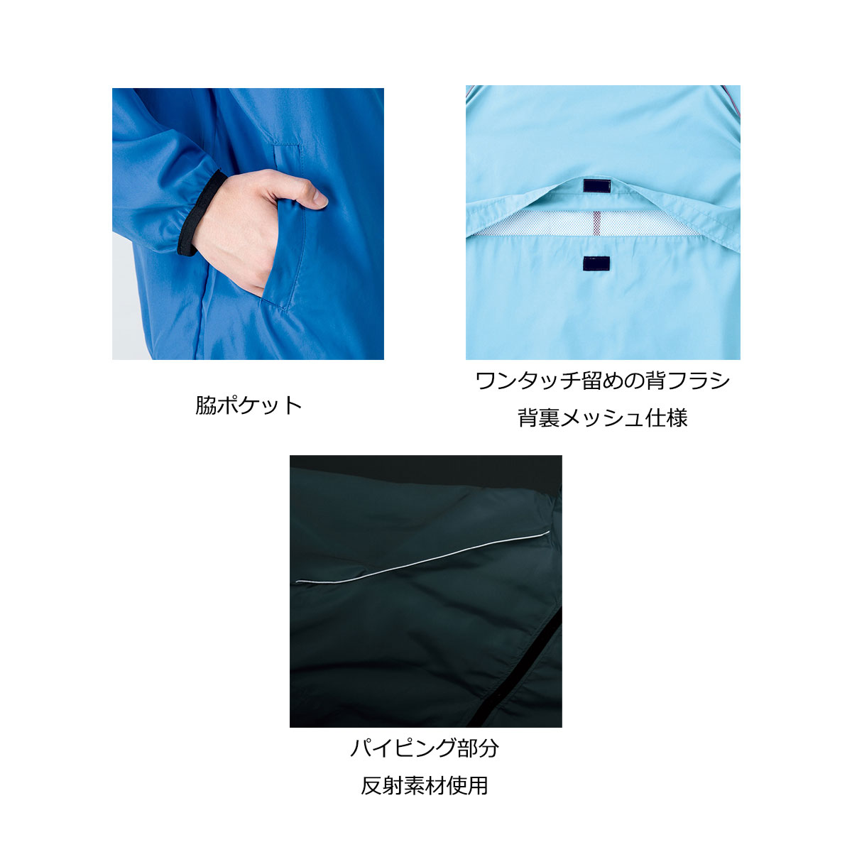 肩の切り替え部分のパイピングは反射素材を使用しているので暗いところでの安全性を高めます。