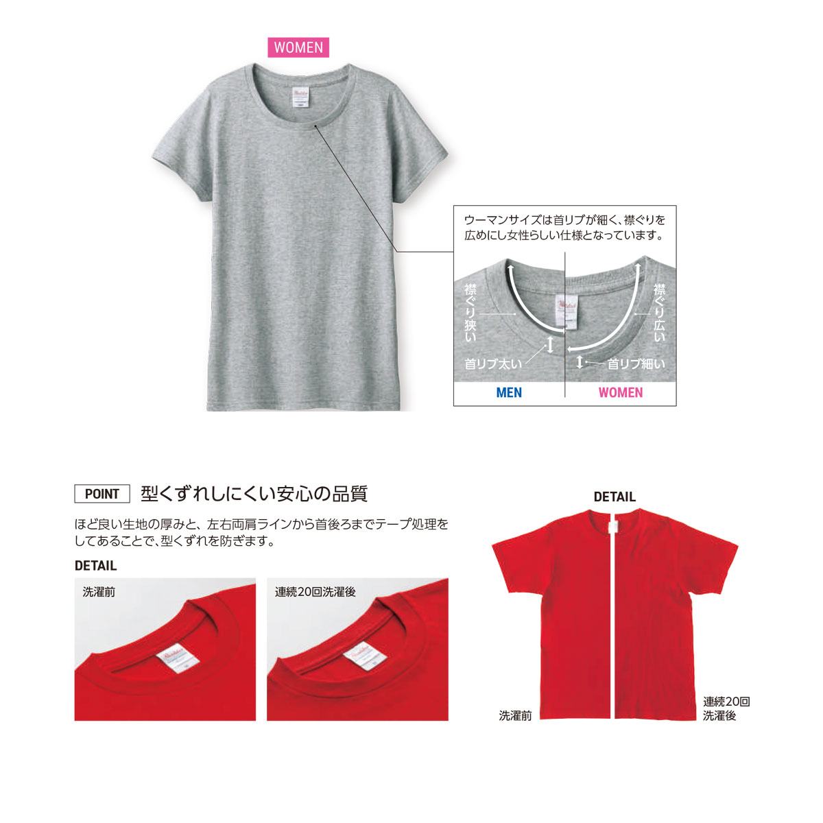 WM、WLサイズは首リブが細く、襟ぐりが広めのキレイ目な服にも合わせやすいレディースシルエット。