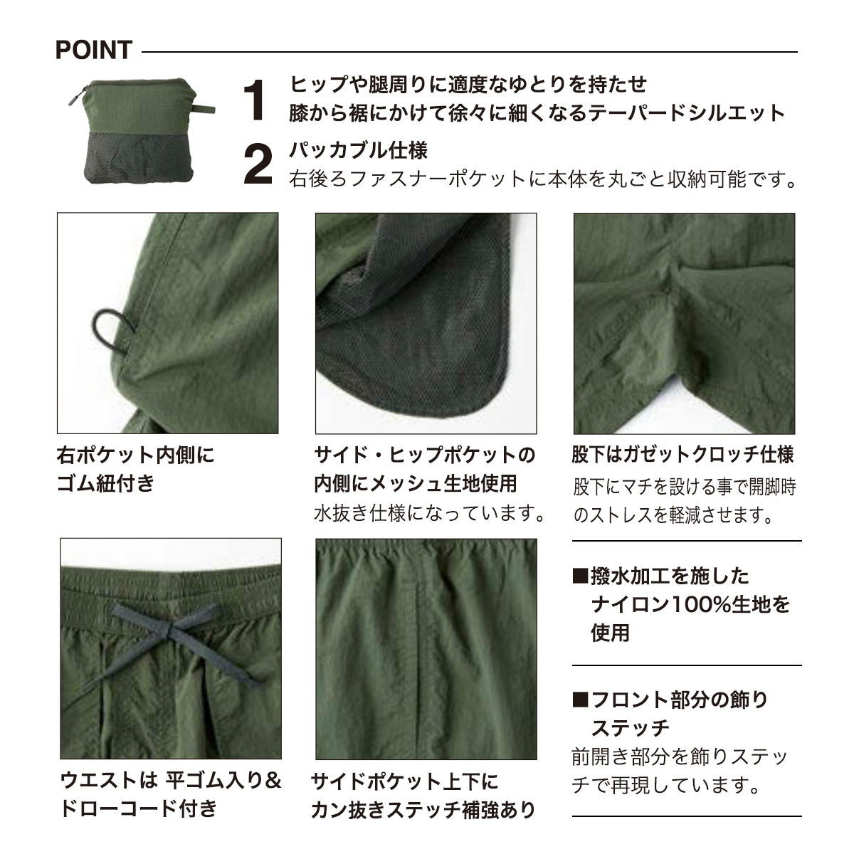 撥水加工が施された多用途なナイロンパンツ。