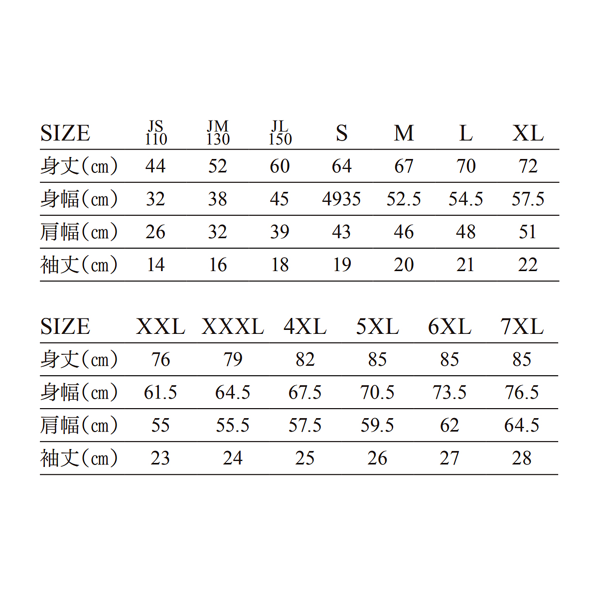 サイズはキッズサイズから7XLまで幅広い展開です。
