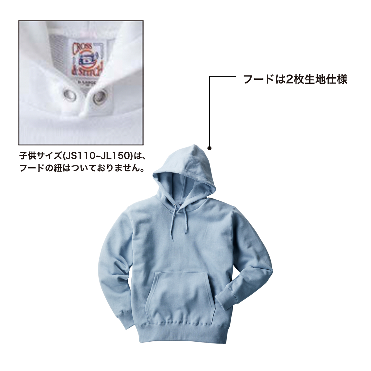 ※子供サイズ(JS110~JL150)は、フードの紐はついておりません。