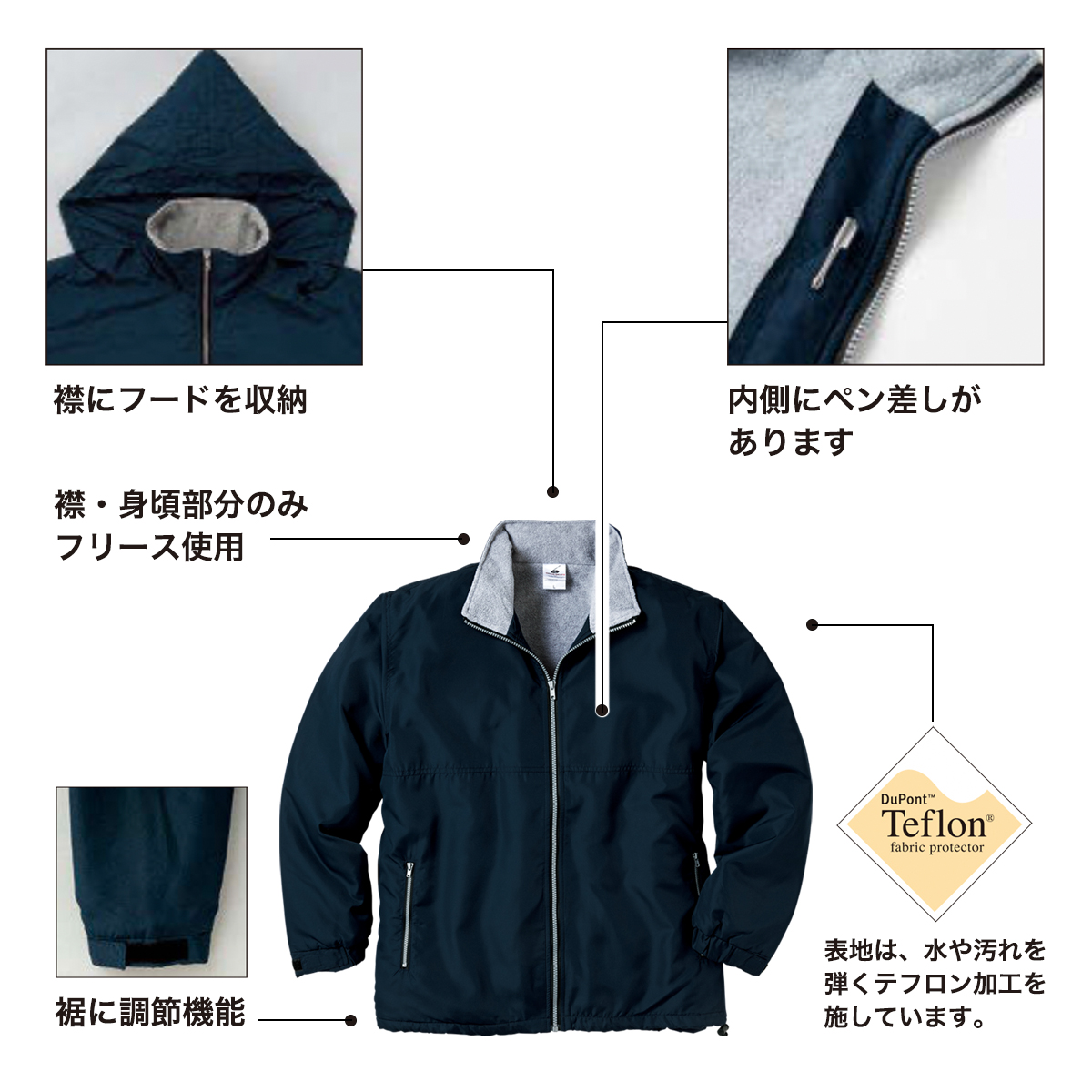 襟にはフードが収納でき、袖も調整機能があるので、