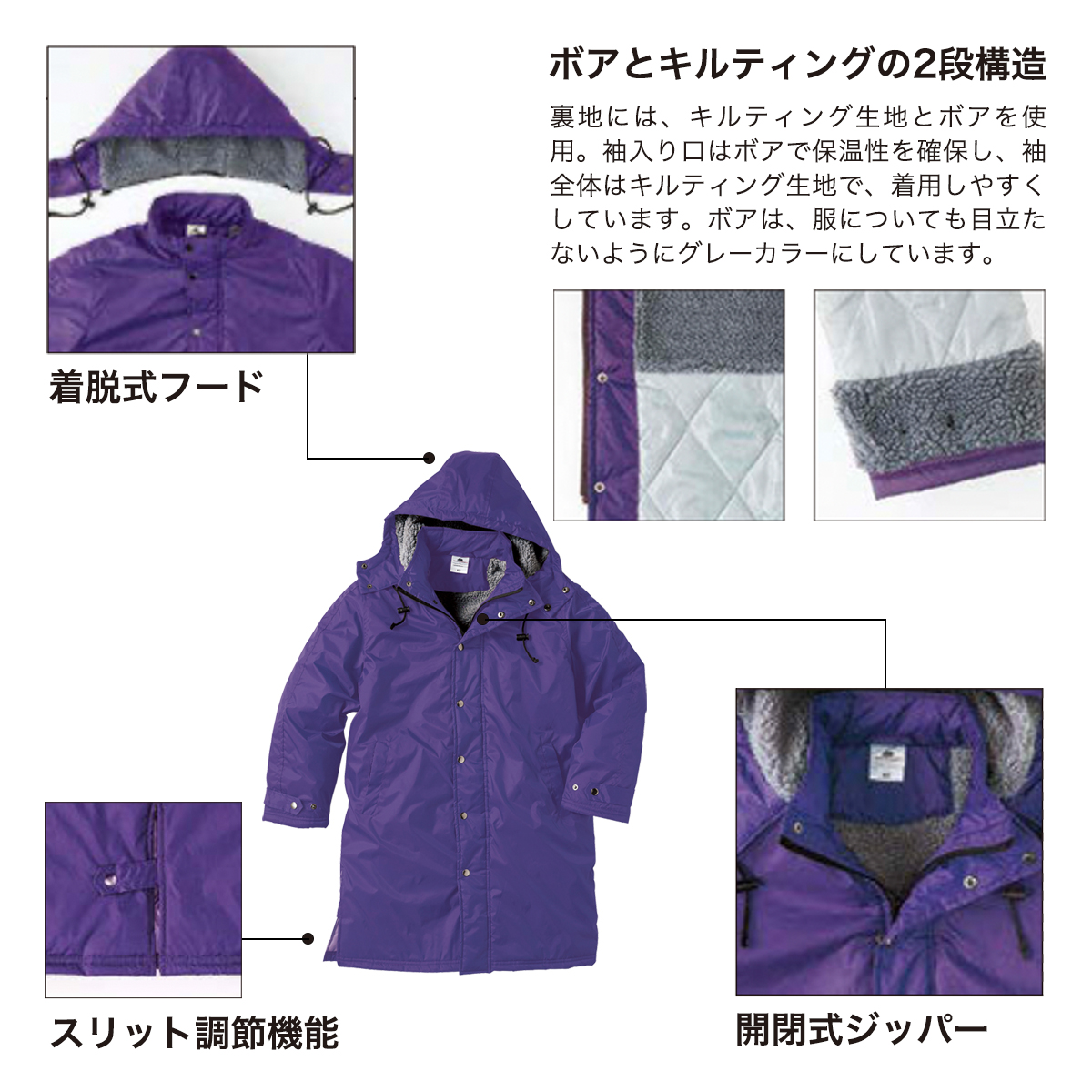 冬の屋外に最適、中綿入りで保温性抜群のベンチコート。