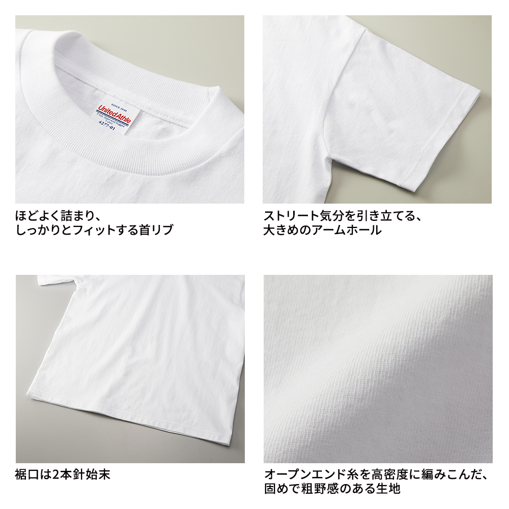 小さすぎず、大きすぎないちょうどいいルーズ感のTシャツはアメリカのTシャツで一般的なオープンエンド糸を採用。太くて短い繊維を空気を含みながら紡績した質感は、日本で一般的な、なめらかな肌ざわりとは反対の、ガサっとしたドライな仕上がりに。