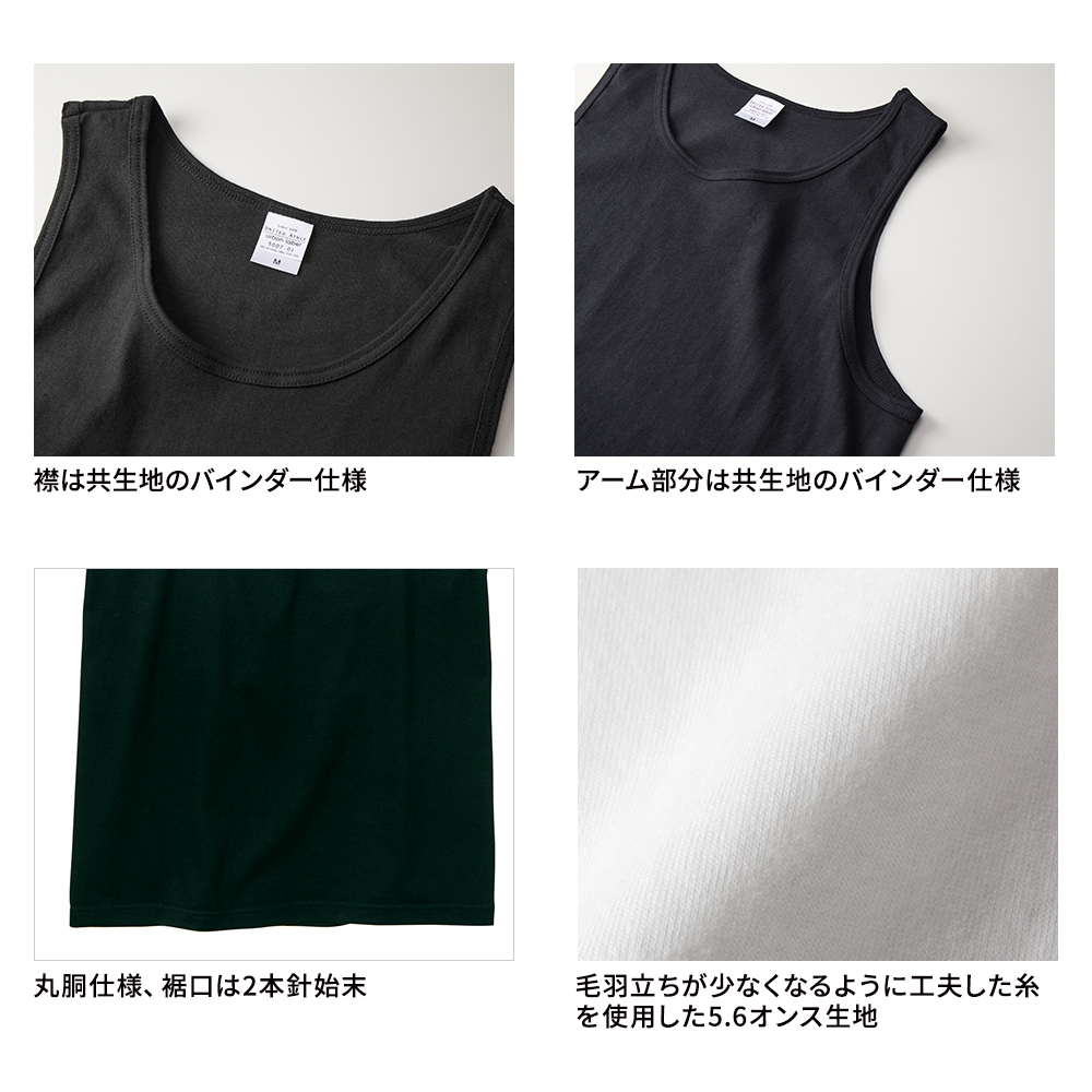 United Athleの代表商品 No.5001-01のTシャツと同じ素材のタンクトップは、型崩れのしにくいのが特徴です。