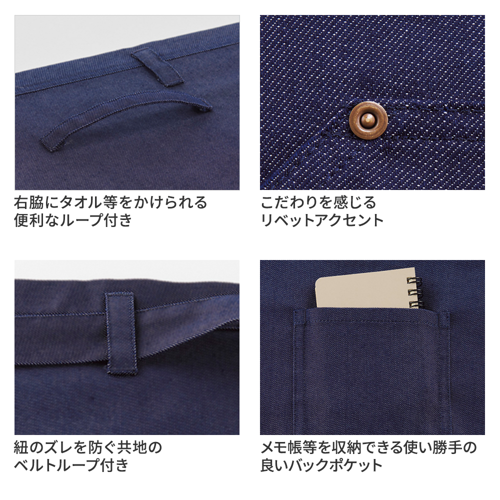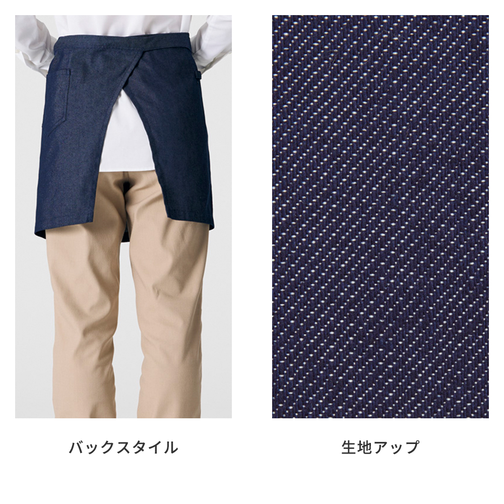 キッチンでの作業が一層快適になる、耐久性とファッション性を兼ね備えたデニム調ショートエプロンです。