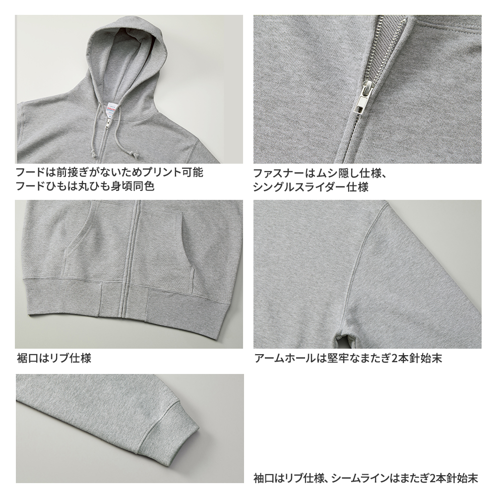 特徴:フード二重後接ぎあり、ファスナーはシングルスライダー、フードひもは丸ひも身頃同色