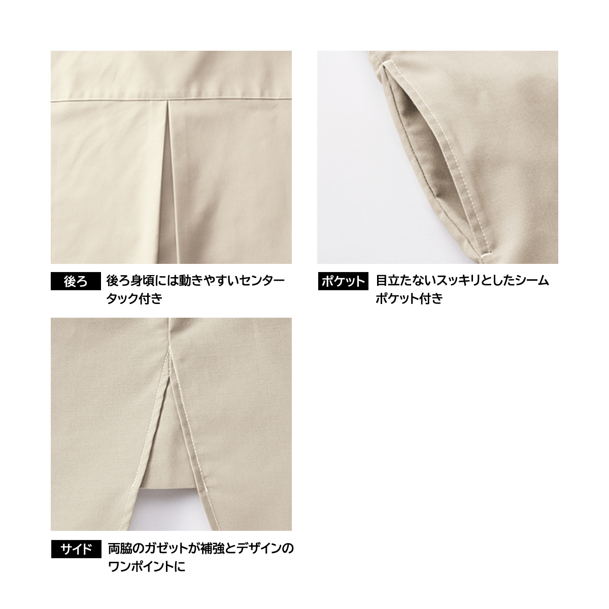●特徴:両脇シームポケット・背中心インタック・両脇ガゼット仕様