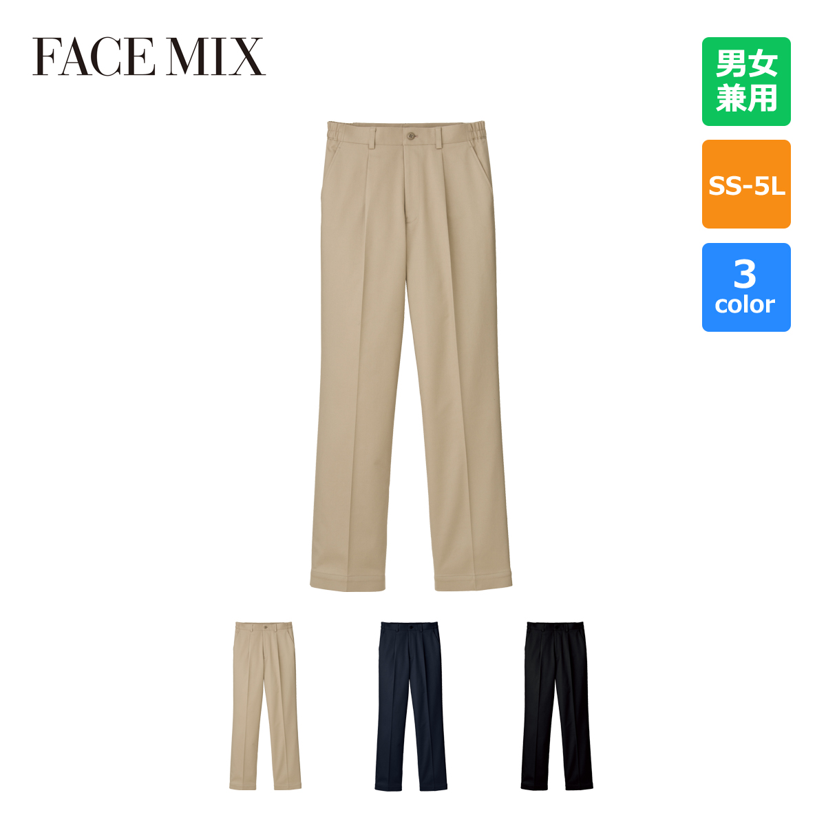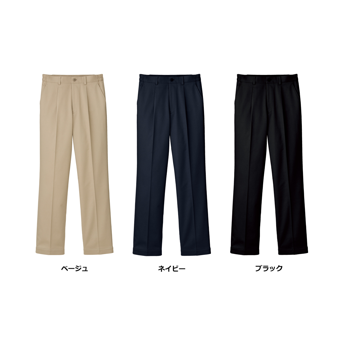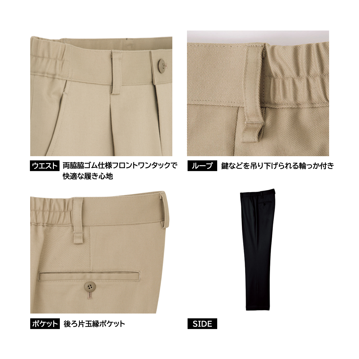 ●特徴:パンツ裾上げ機能・ウエスト両脇ゴム入り・フロントワンタック