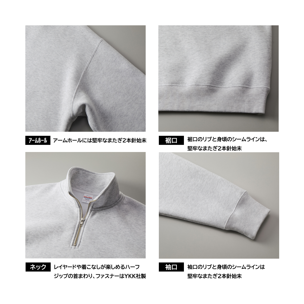 このハーフジップスウェットに刺繡やプリント加工をしてオリジナルスウェット(オリジナルトレーナー)を作成しませんか。