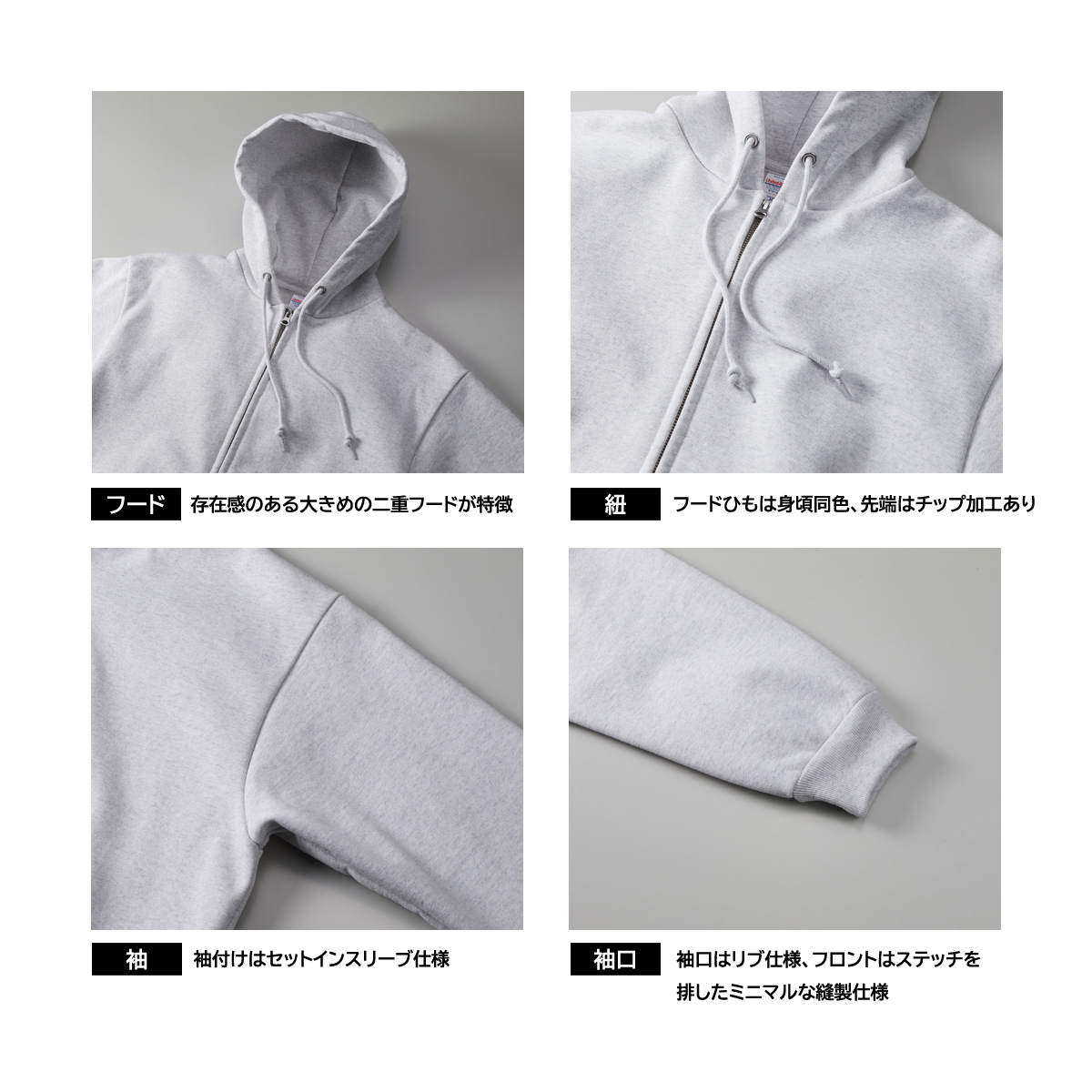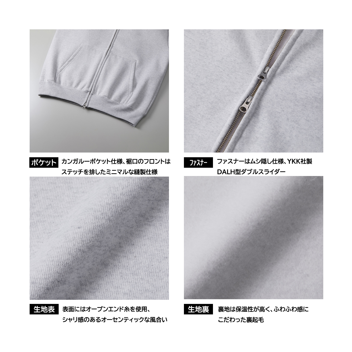 特徴:ファスナーはYKK社製 ダブルスライダー、フードひもは丸ひも身頃同色、フード二重後接ぎあり