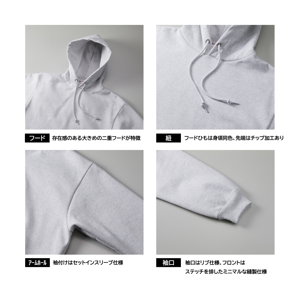 特徴:フードひもは丸ひも身頃同色、フード二重後接ぎあり