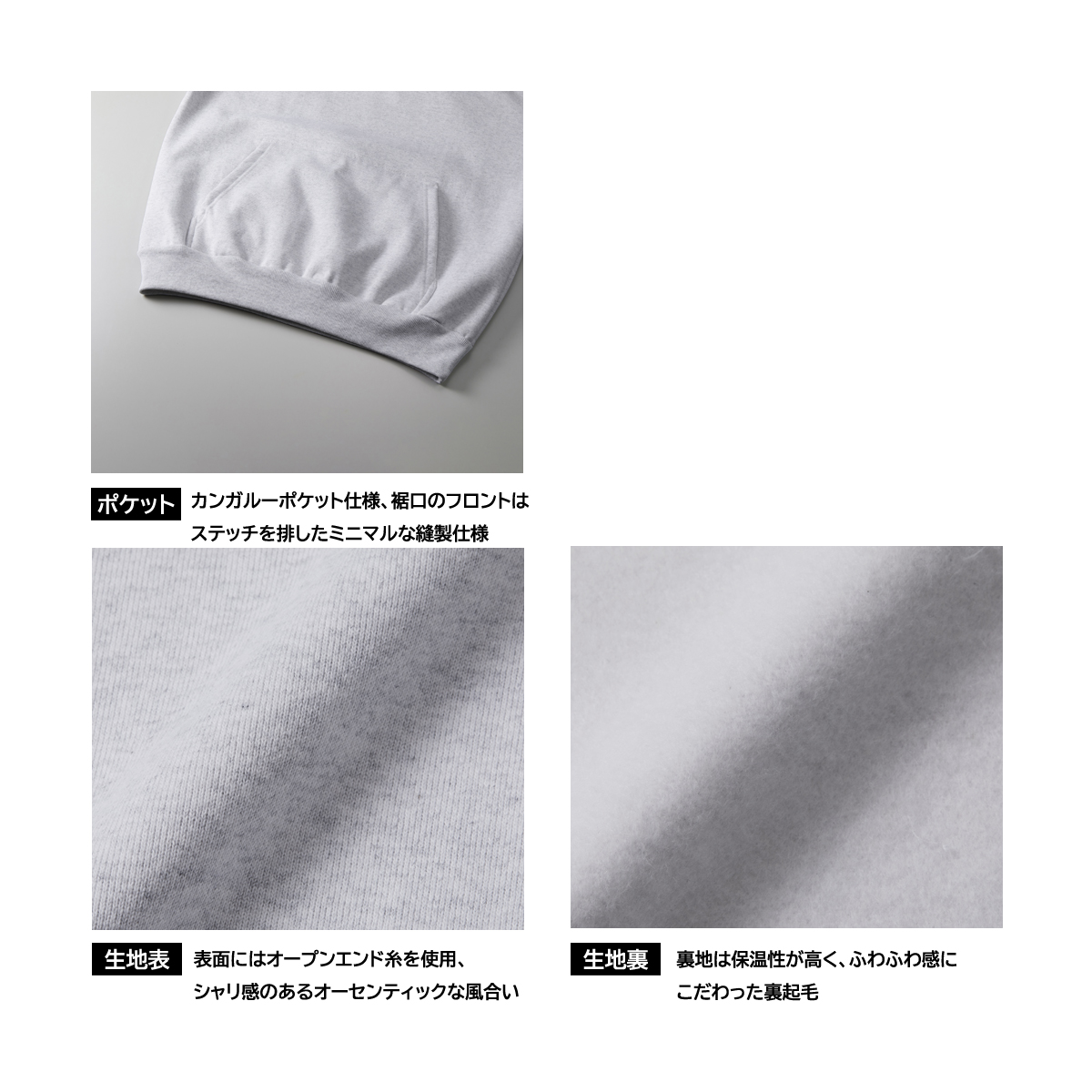 素材:綿 80%、ポリエステル 20% 裏起毛(表面:オープンエンド糸)
