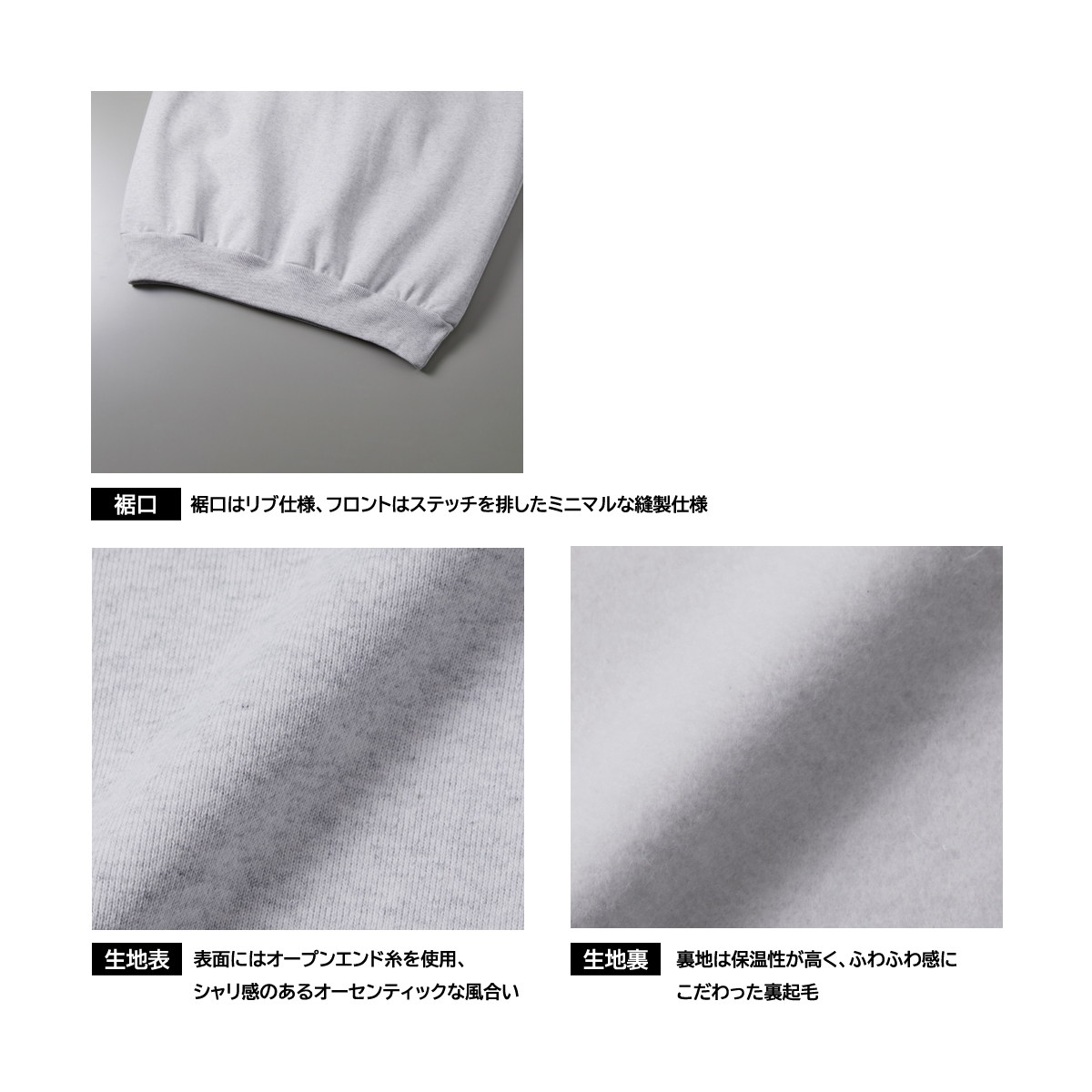 生地の表糸にはオープンエンド糸を使用しているので、独特のガサ感の粗い感じに仕上がっています。着れば着るほどに味わいがでて、経年変化をお楽しみいただけるアイテム。