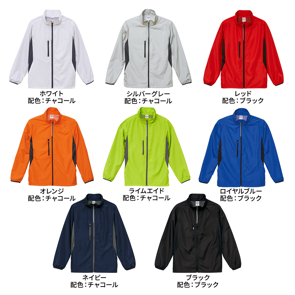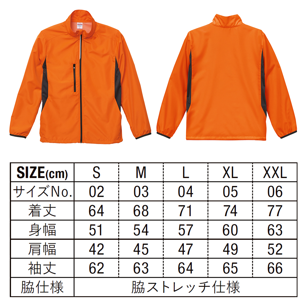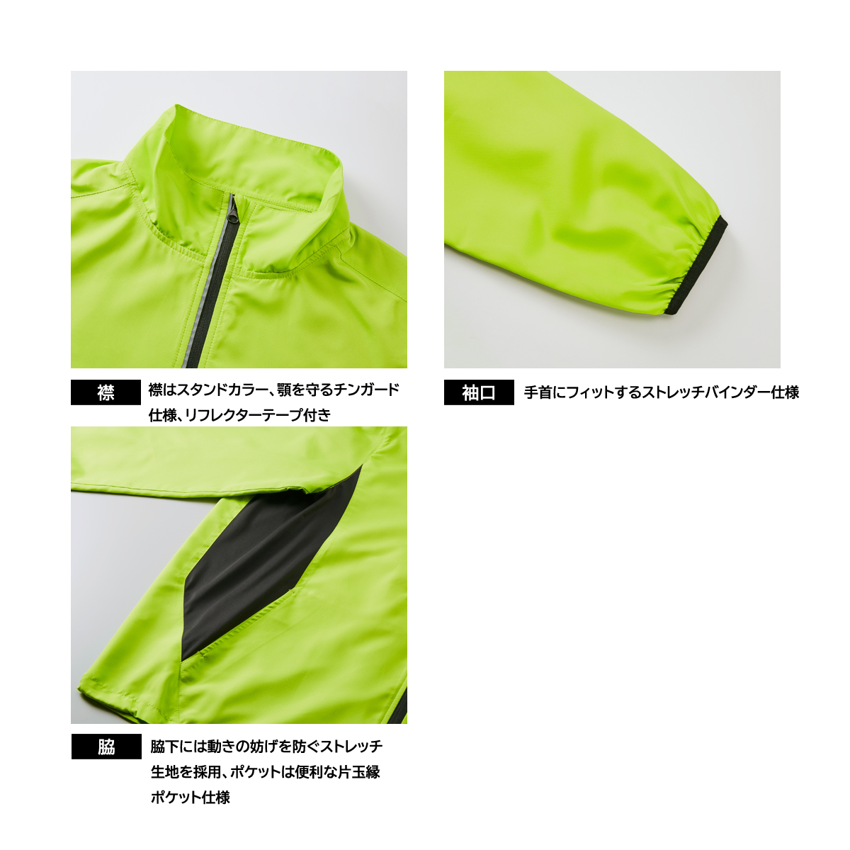 特徴:ファスナーはシングルスライダーフロントファスナー(襟もと)はリフレクターテープ付き、撥水、防風、裾フラシ、