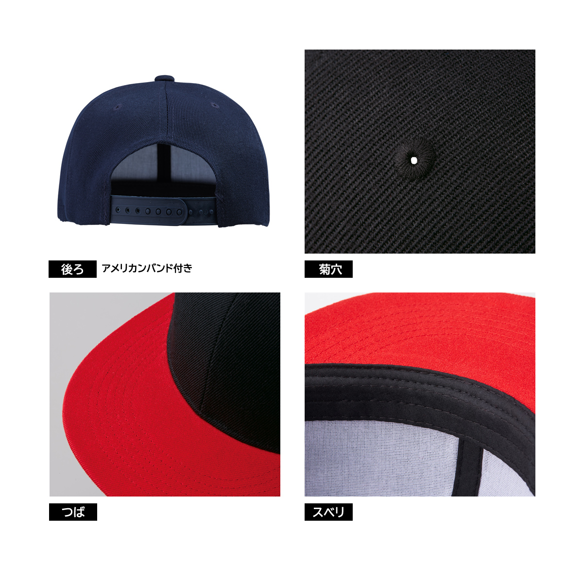 6パネルで頭の形にそったきれいなシルエットで、アメリカンバンドでサイズ調節が可能です。