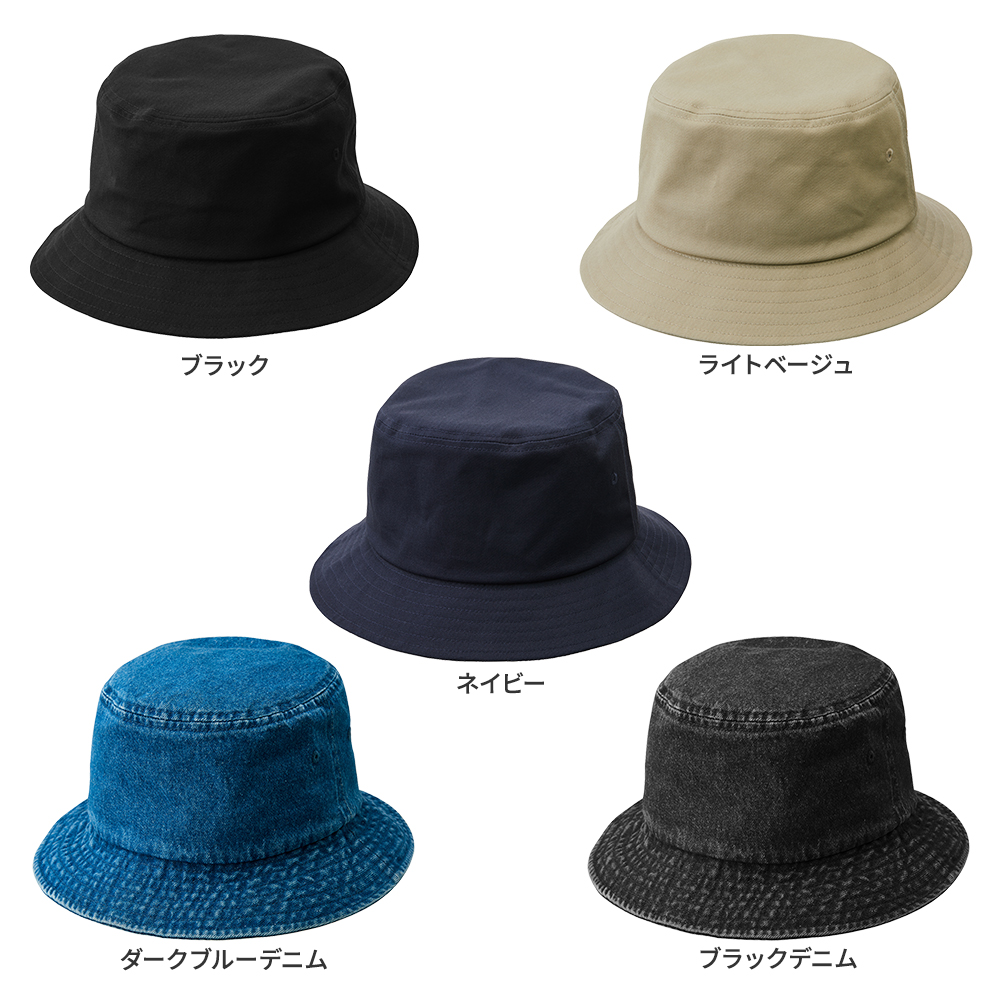 しっかりとした生地感でシワになりにくいのもコットン ツイル バケット ハットの魅力です。カラーはベーシックなブラック、ライトベージュ、ネイビーの3色と、デニムカラー2色の5色展開でどの色も便利で合わせやすいです。