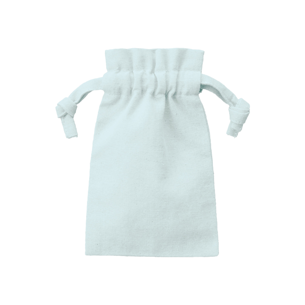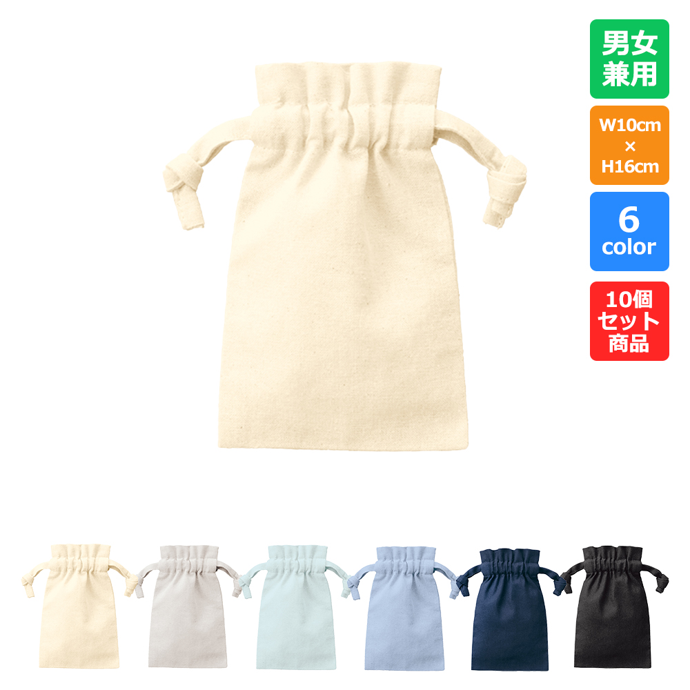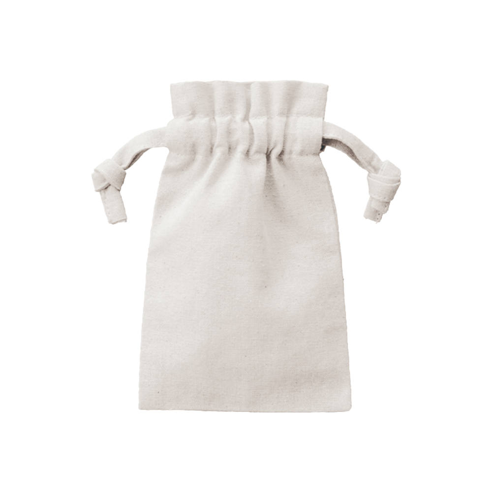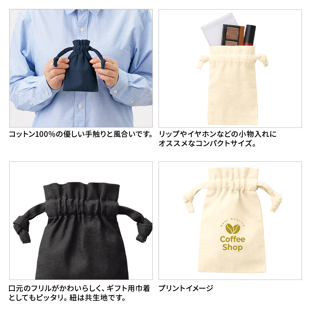 5オンスの厚みのある厚手の綿100%巾着です。ベーシックな形状ながら、口元のフリルがかわいらしい印象です。