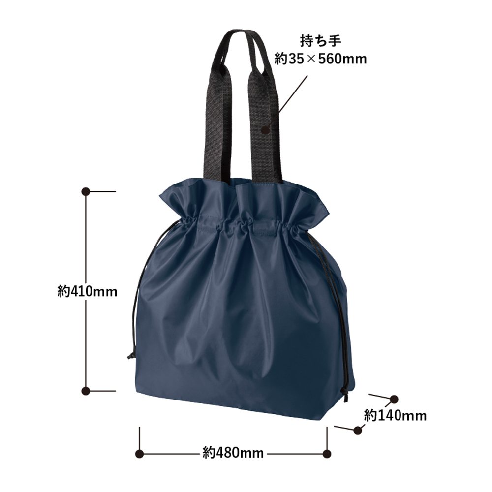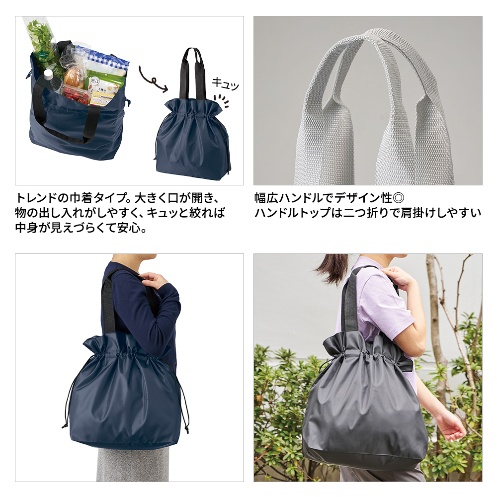 大きく口が開くので荷物の出し入れがしやすく、きゅっと紐を絞ることで、中身が見えづらくなるのが安心ポイントです。