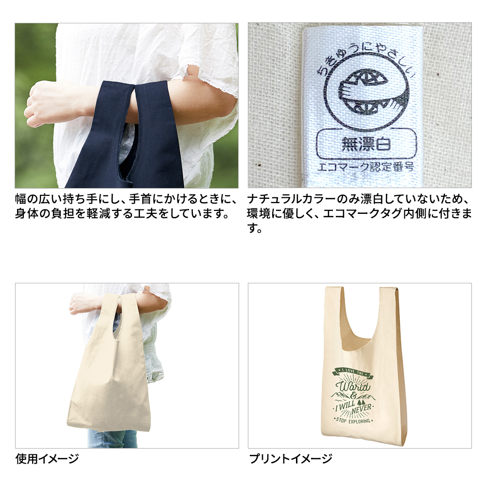 エコマークとは、生産から廃棄まで全体を通して環境への負担が少なく、環境保全に役立つと認められた商品に付けられた環境のラベルです。このバッグのナチュラルカラーはエコマークを取得した無漂白の自然な風合いの商品です。