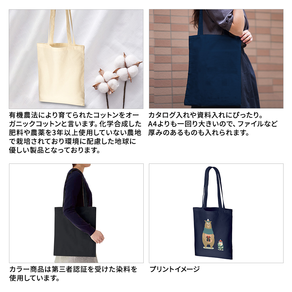 オーガニックコットンを100%使用したA4フラットトートバッグです。