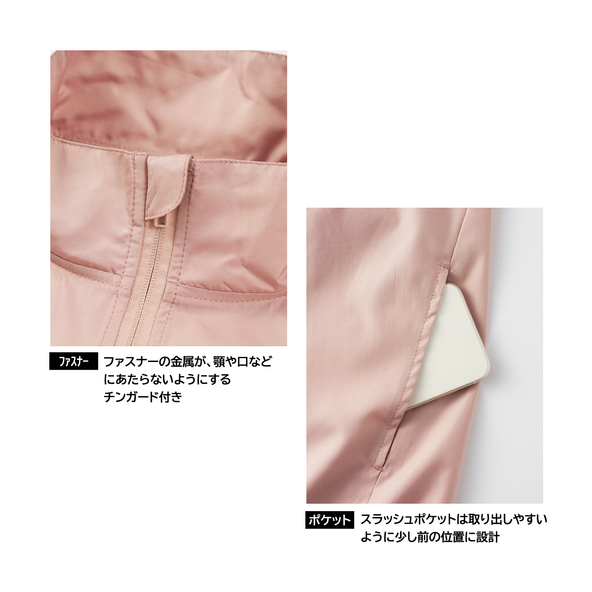 ニュアンスカラーが魅力のスタンドジャケット。すっきりとしたミニマルなデザインで、コーディネートしやすい一枚です。再生ペットを37%使用したサステナブルな素材を採用。風を通しにくく、ジャケット内の湿気を逃がすことで快適な着心地を実現。さらに撥水加工も施されているので、さまざまなシーンで活躍します。1枚持っていると便利なアイテム。7色展開です。