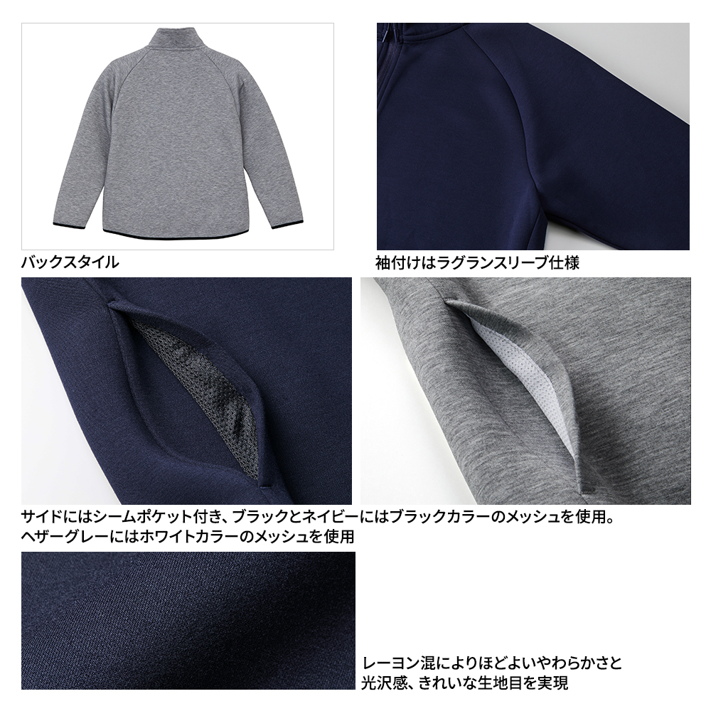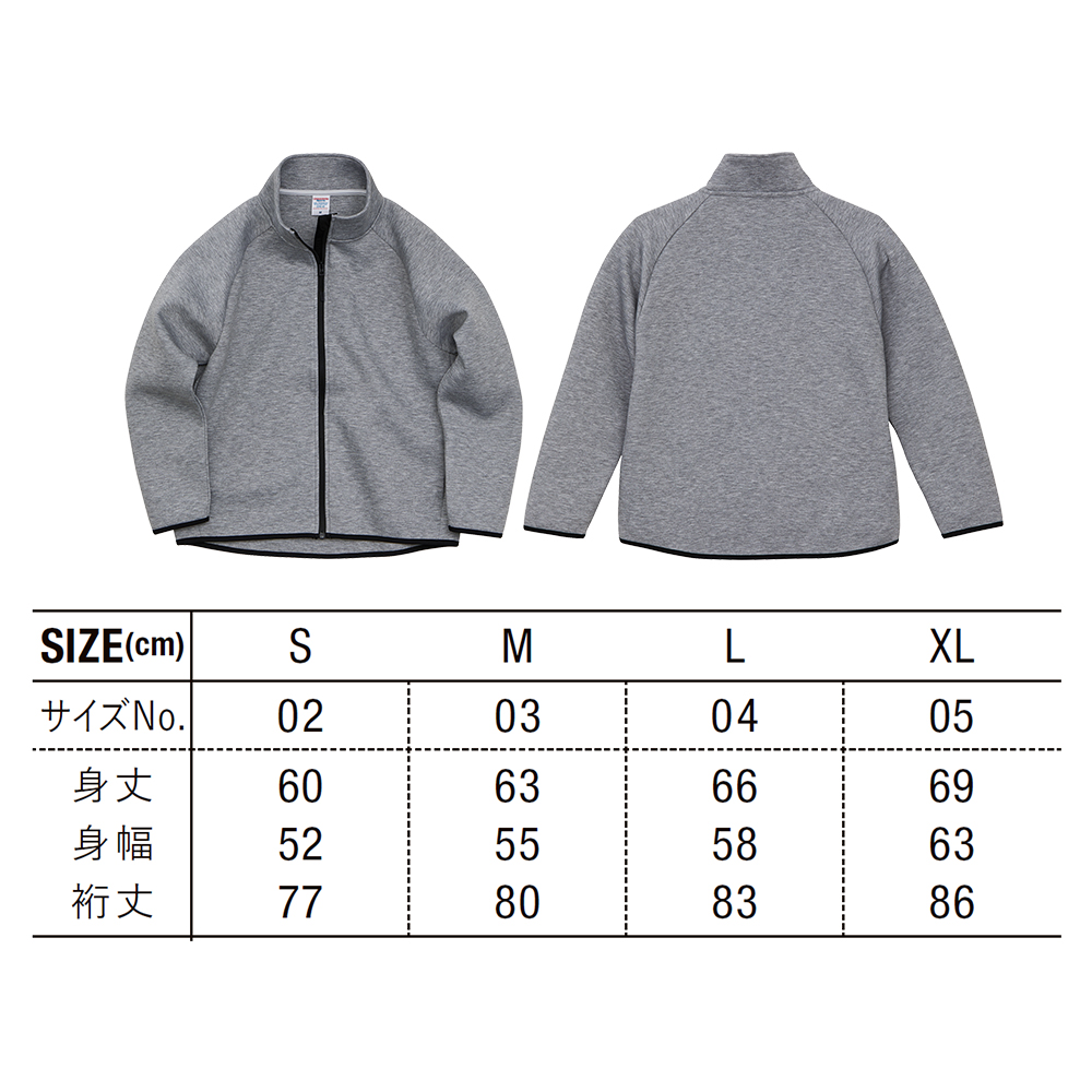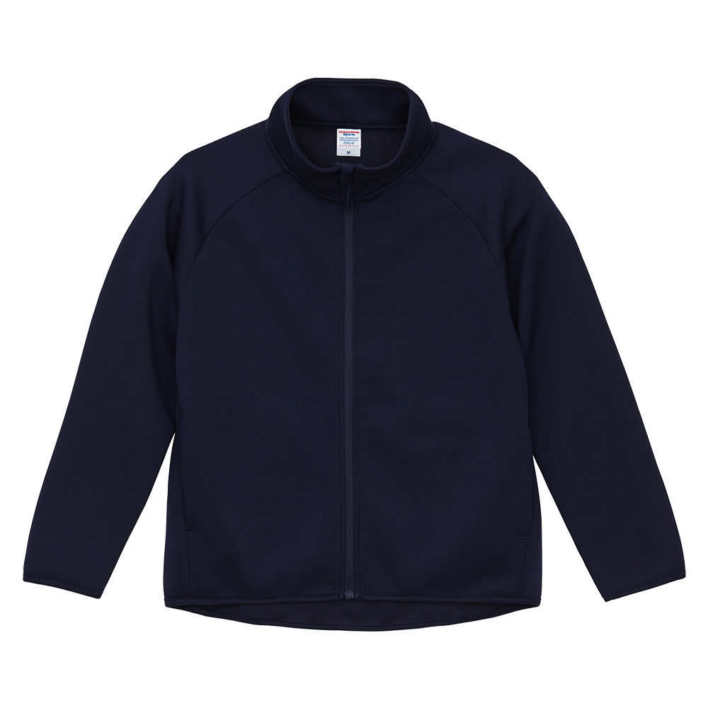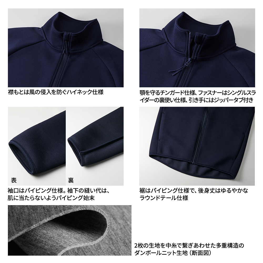 2枚の生地を中糸でつなぎ合わせており、空気の層ができることにより保温性にすぐれ、軽くてシワになりにくく、ストレッチ性も兼ね備えたダンボールニット生地のフルジップスタンドジャケット。