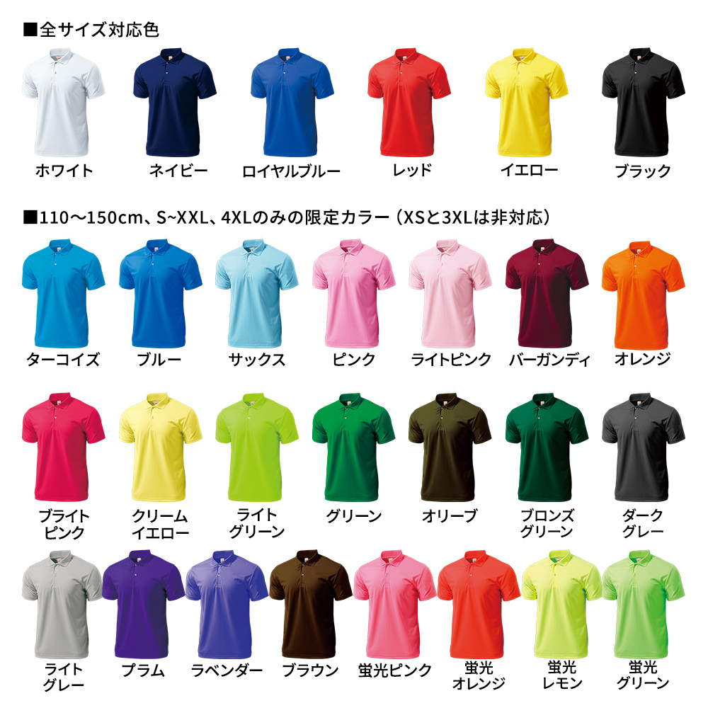 キッズサイズから4XLまで様々な体型の方に着用いただけるドライポロシャツです。