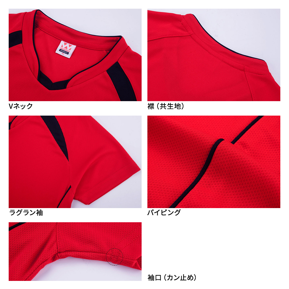 バレーボール向けに動きやすさを追求しており、少し短めのラグラン袖とVネック2重衿でスポーツティなデザインです。