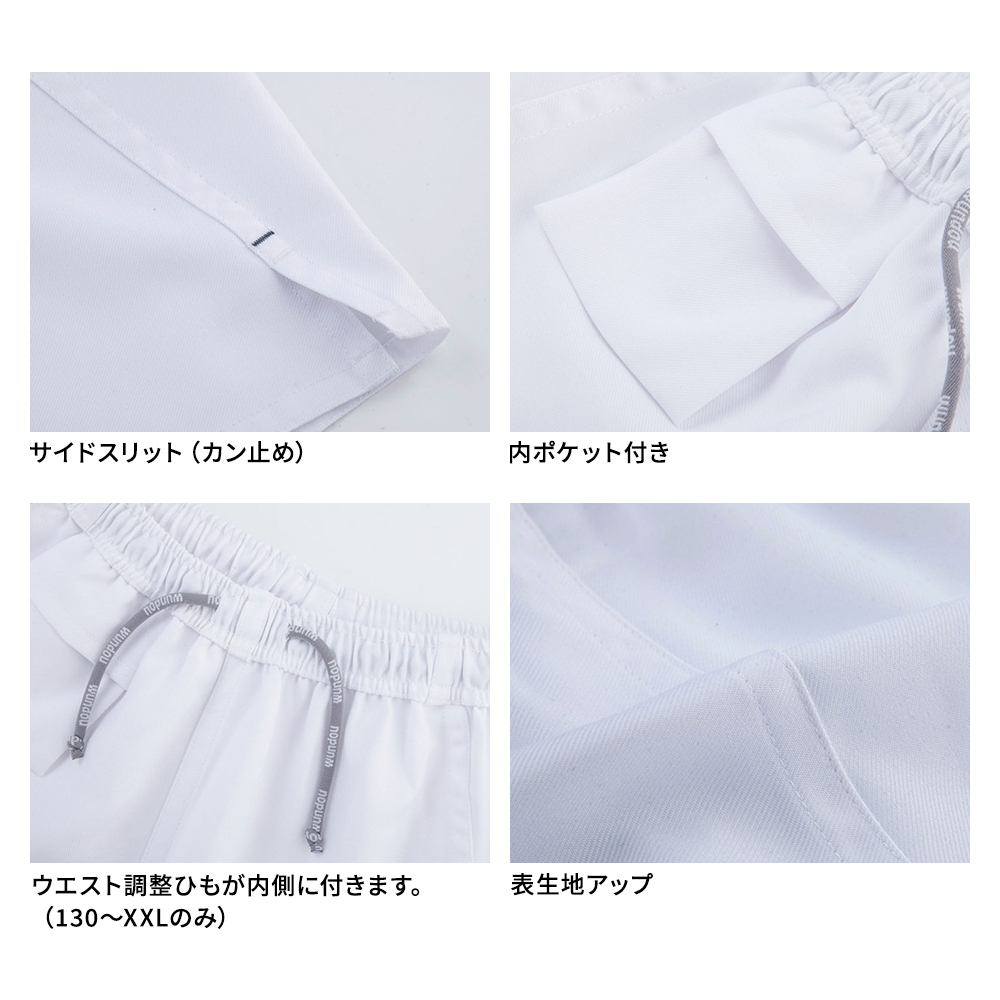 サイドスリット、ウエスト調整紐、内ポケット付きの使いやすいパンツです。